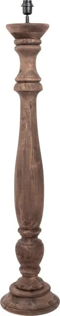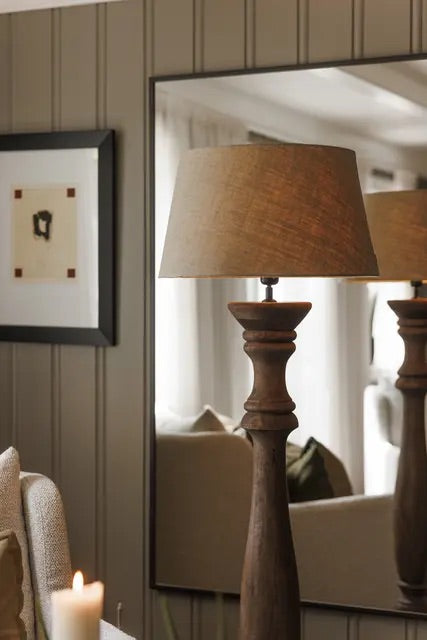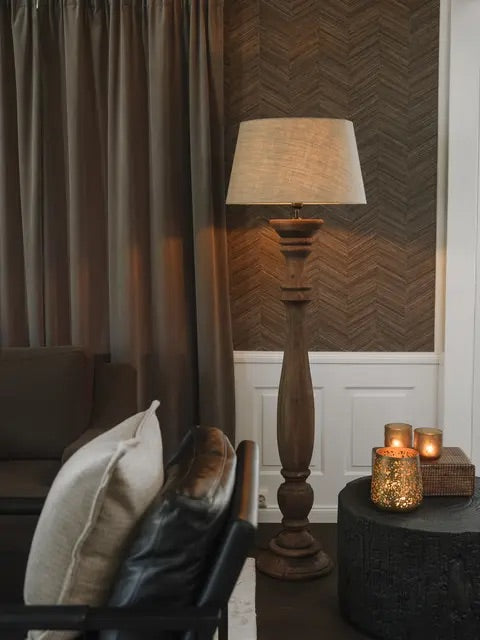 Denne dekorative gulvlampen i heltre kombinerer klassisk håndverk med naturlig varme. Den dreide lampefoten i mellombrun finish gir et tidløst uttrykk som passer perfekt både på hytta og i hjemmet. Det robuste treverket tilfører en lun og innbydende stemning, og gjør lampen til et elegant blikkfang i rommet.