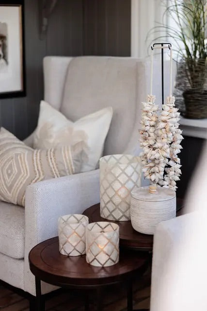 Skap en lun og innbydende stemning med denne vakre telysholderen fra Halvor Bakke. Laget av delikate capiz-skjell i en kremhvit nyanse, gir den et sofistikert og organisk uttrykk. Det subtile, rutete mønsteret slipper gjennom et mykt og varmt lys når telyset er tent – perfekt for rolige kvelder eller som dekorativt blikkfang på bordet.