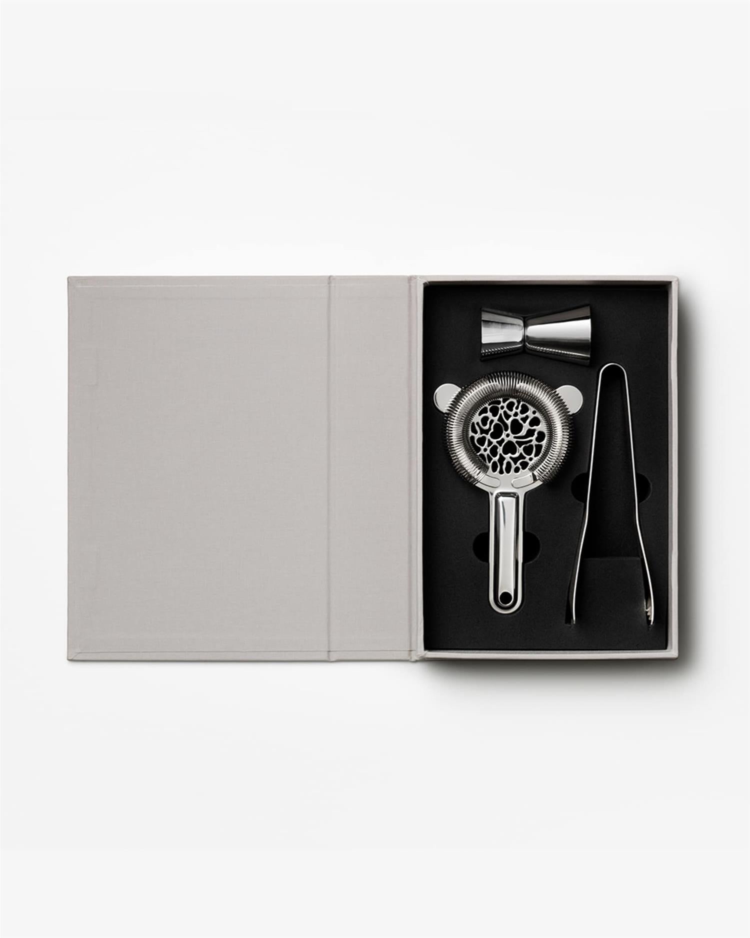 Oppdag det perfekte settet for å lage forfriskende og balanserte cocktails – presentert i en elegant bokformet eske som også fungerer utmerket som gave. Dette settet inneholder alle verktøyene du trenger for å mestre mixologi på hjemmebaren. Alle produktene er laget i rustfritt stål og tåler oppvaskmaskin, noe som gjør dem både holdbare og praktiske.