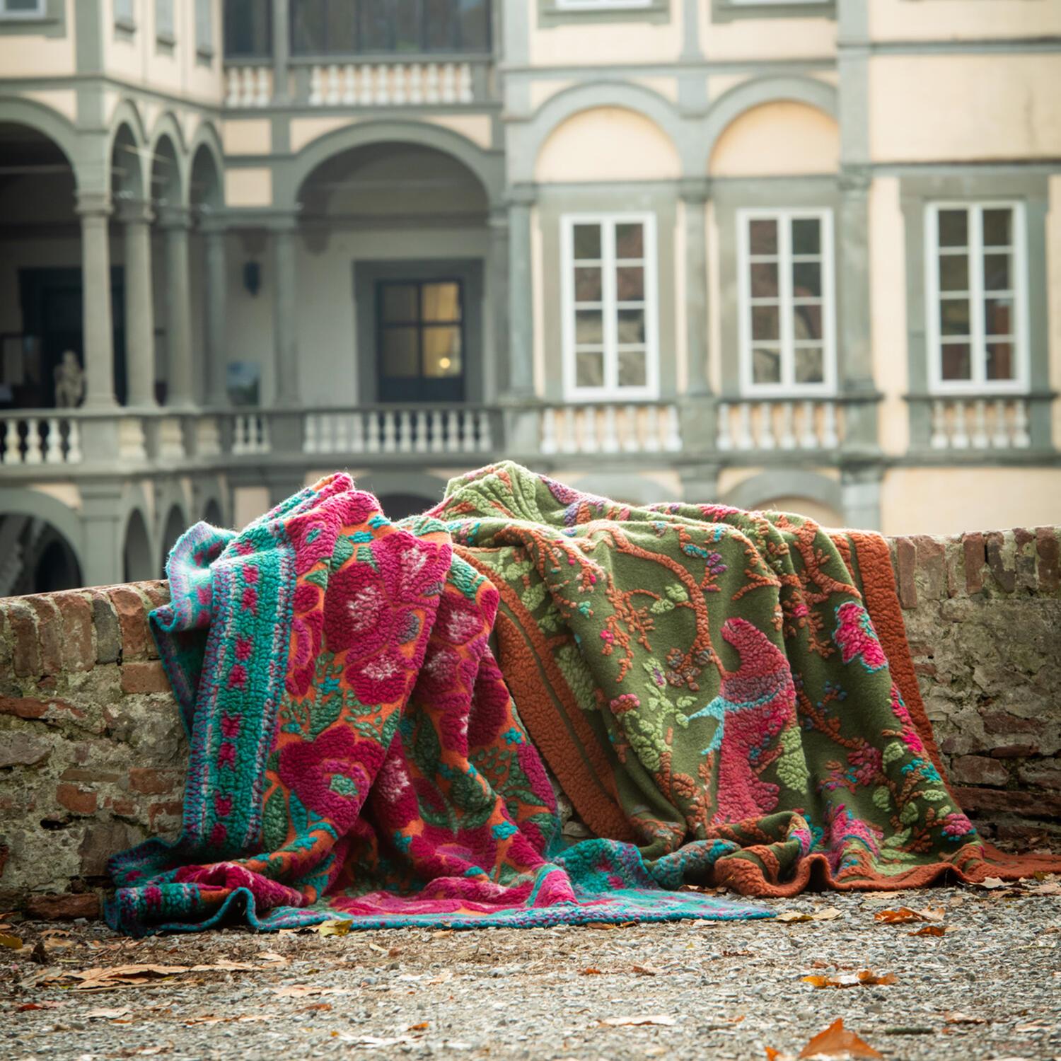Et eksklusivt og uttrykksfullt pledd som kombinerer kunstnerisk design med naturlig komfort. Plaid Paradisiaco Senapeer laget i kokt merinoull av høy kvalitet – et materiale kjent for sin mykhet, letthet og varmeisolasjon.