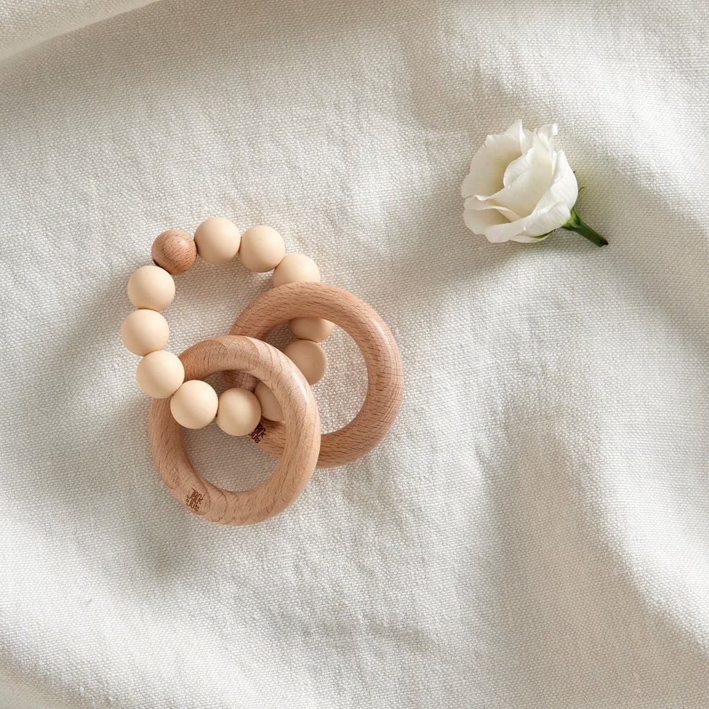 Biteringen er laget av høykvalitets, matsikkert silikon og glatt bøketre – materialer valgt for både komfort og sikkerhet. Den faste trestrukturen og de myke silikonperlene gir ulike teksturer å utforske, noe som stimulerer barnets sanser samtidig som den beroliger. Designet gjør den enkel å rengjøre og robust nok til daglig bruk.