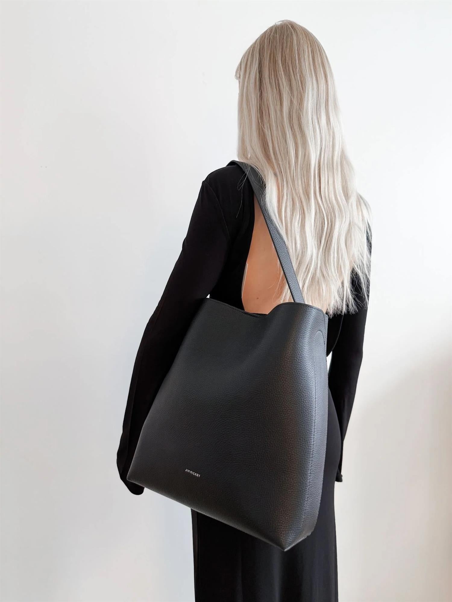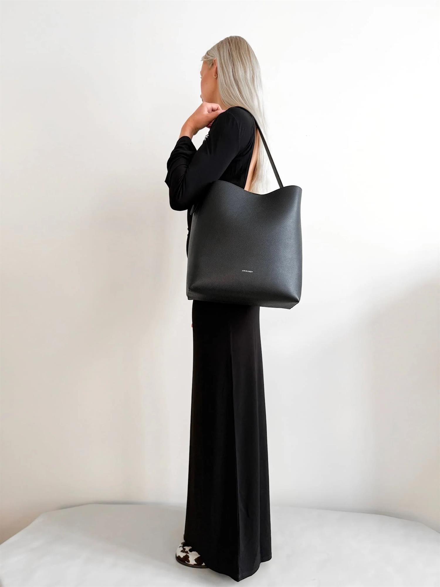 Elegant og funksjonell tote bag i sort kuskinn, designet for den moderne kvinnen. Vesken har et eget laptoprom, praktiske innerlommer og en justerbar skulderstropp. Perfekt for både jobb og hverdag. Fôret med myk mikrofiber og leveres med støvpose.
