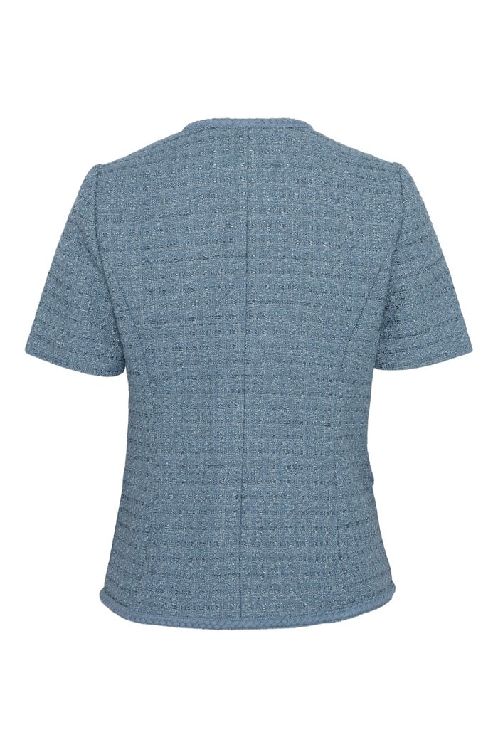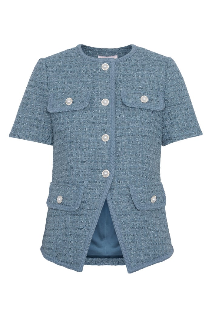 Abbot Top fra Love Lolina er en tidløs og elegant topp som kombinerer klassisk design med moderne finesse. Den er laget i eksklusiv blå tweed, et stoff som gir både struktur og en luksuriøs følelse. De flettede detaljene langs kantene tilfører et håndverksmessig preg, mens de glitrende perleknappene foran gir et sofistikert og feminint uttrykk.