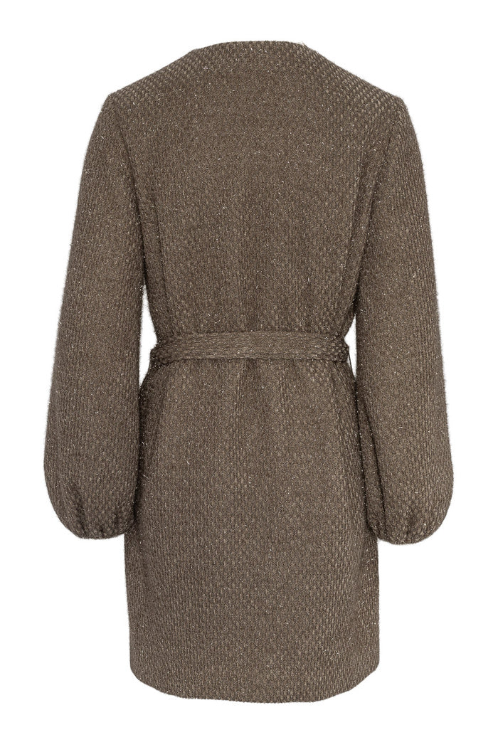 Denne lekre minikjolen kombinerer en avslappet passform med et elegant uttrykk. Den har vide ballongermer, en flatterende V-utringning og et lett skinnende stoff som gir antrekket det lille ekstra. Et avtakbart midjebelte fremhever figuren og gjør det enkelt å variere uttrykket – perfekt både til hverdags og fest.