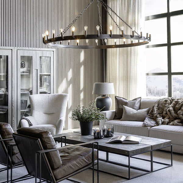 Lampens åpne konstruksjon gir et eksklusivt preg og sprer lyset jevnt i rommet. Med sin generøse størrelse gjør Crown seg spesielt godt over spisebordet, i stuen eller i rom med god takhøyde. Den leveres med lang kjede og ledning, noe som gjør den fleksibel og enkel å tilpasse ulike rom.