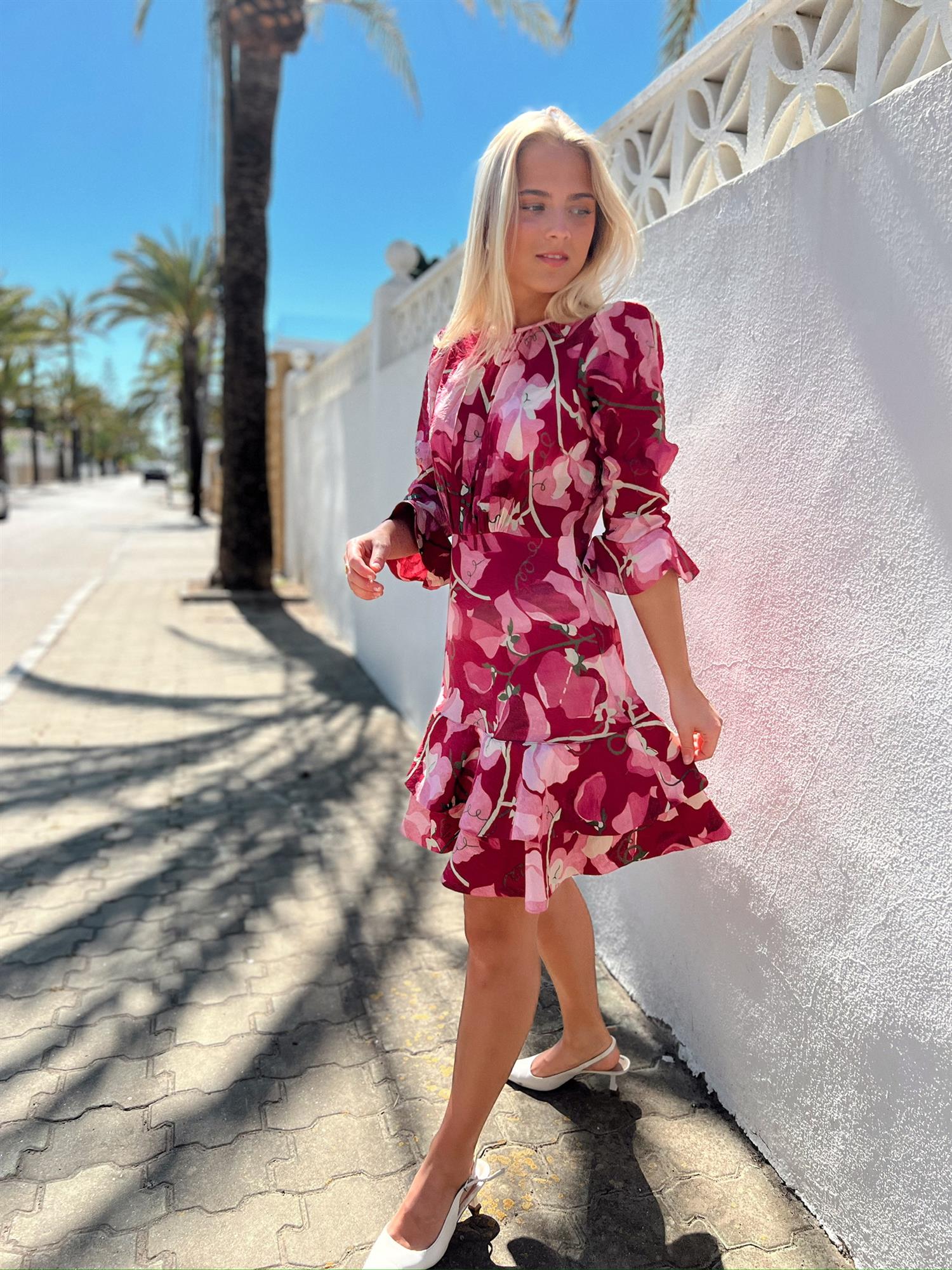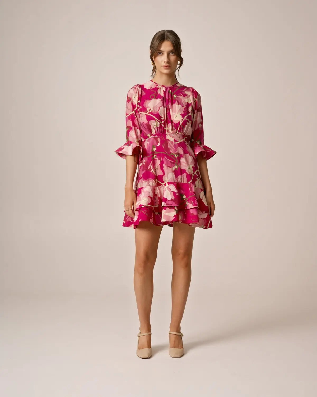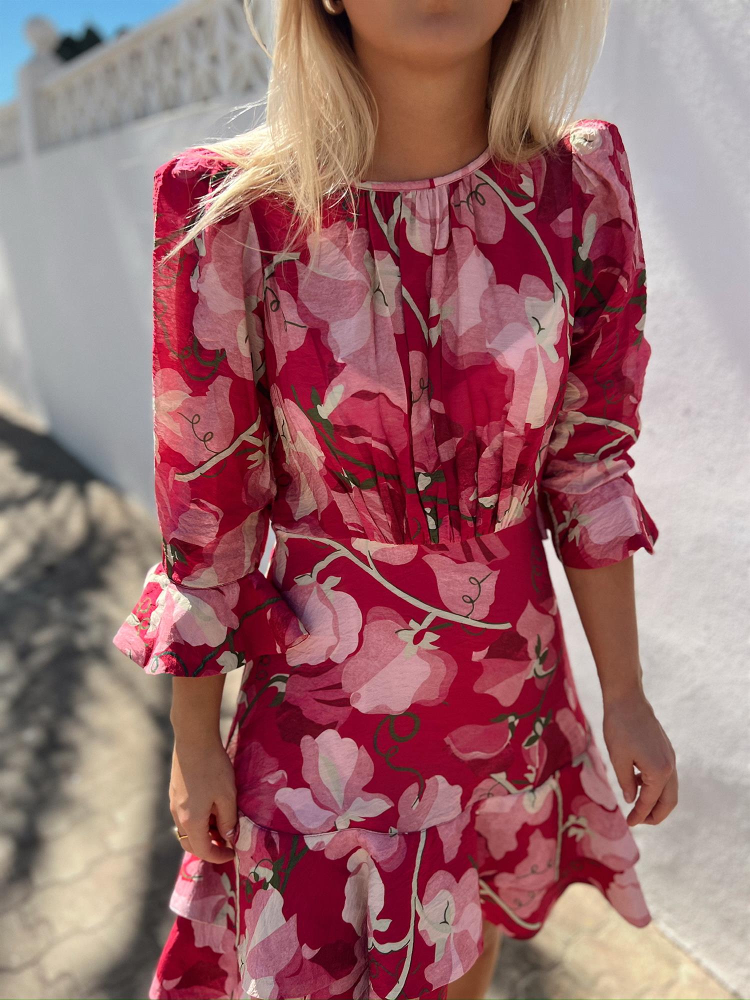 Minikjolen er laget i myk, FSC-sertifisert viskose med en lett kvalitet. Den har rund krage, tettsittende midje og topp, samt trekvartlange ermer med volangkanter som gir et luftig preg.