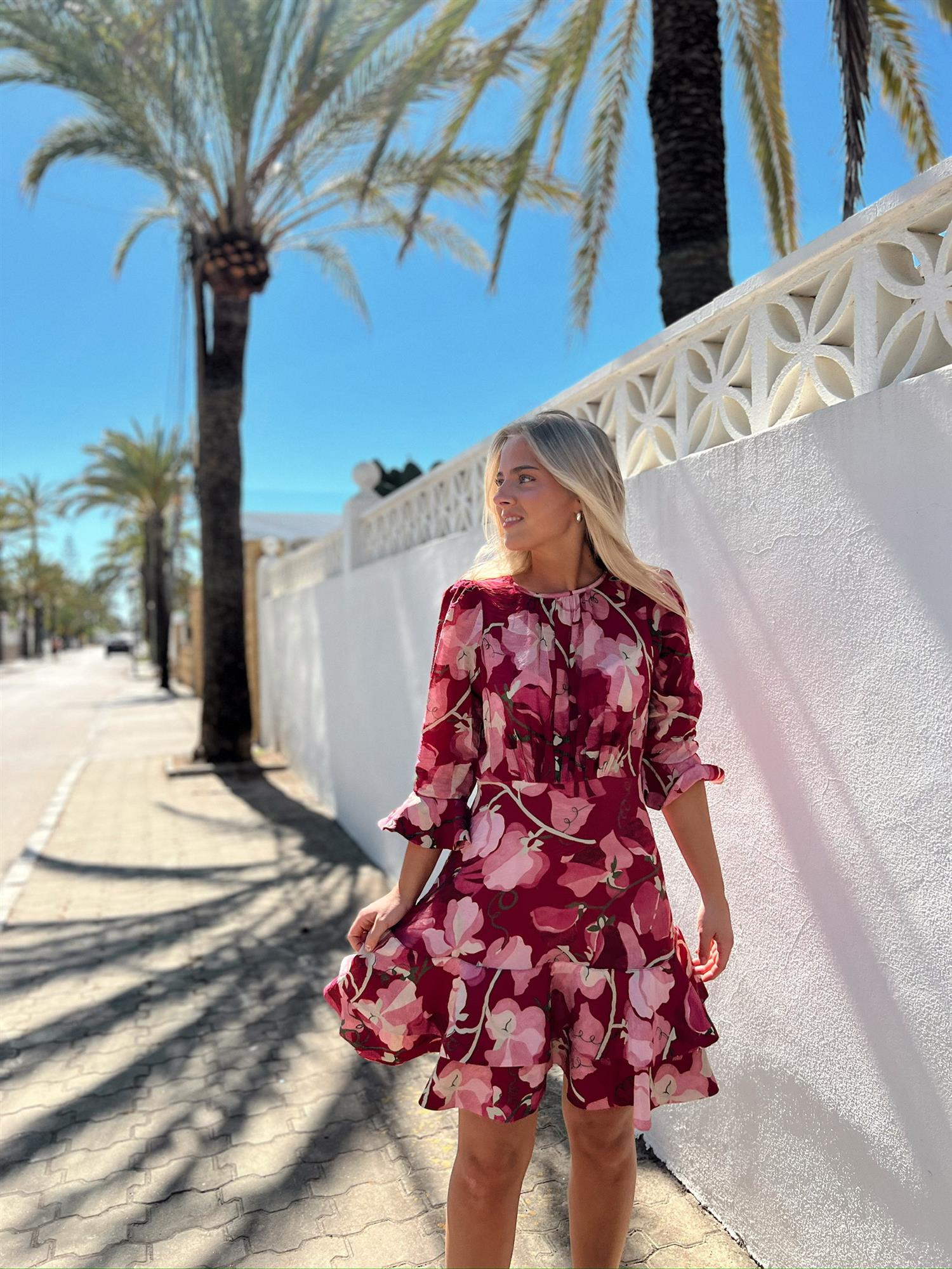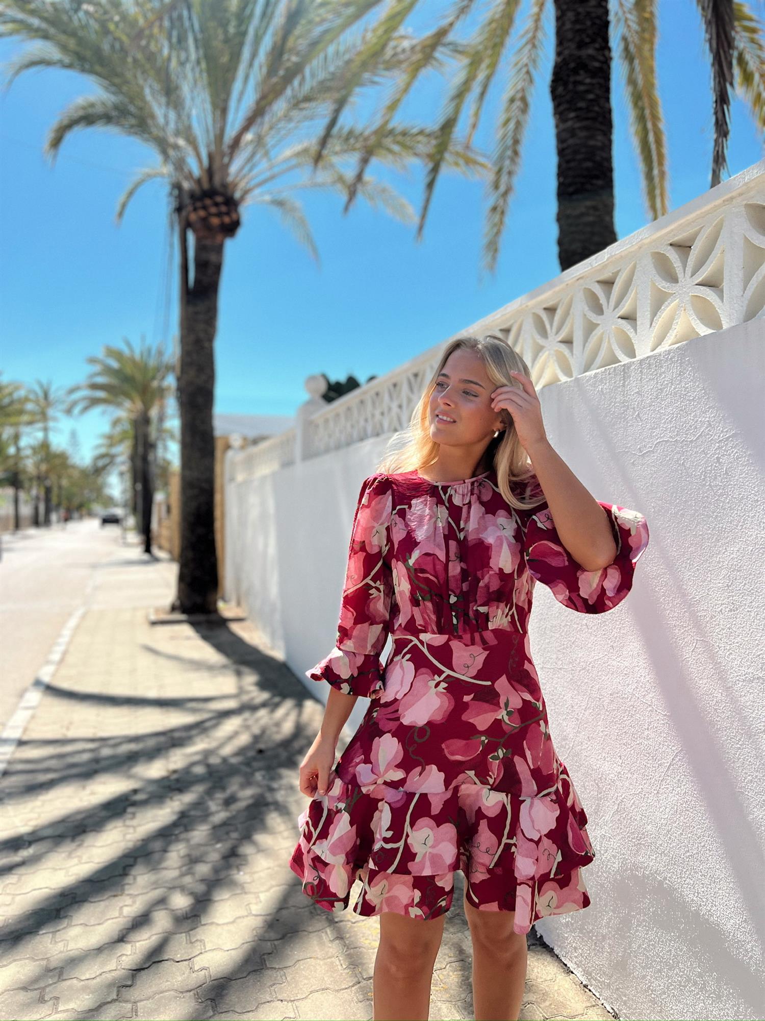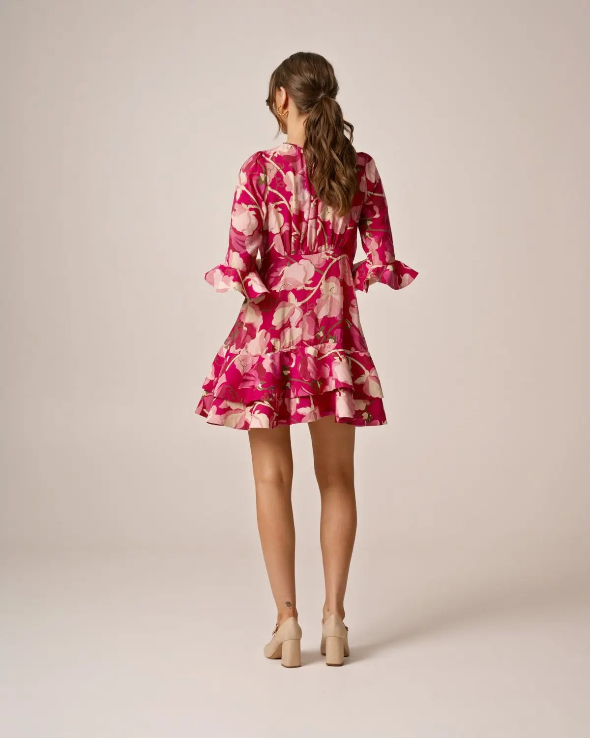 Minikjolen er laget i myk, FSC-sertifisert viskose med en lett kvalitet. Den har rund krage, tettsittende midje og topp, samt trekvartlange ermer med volangkanter som gir et luftig preg.