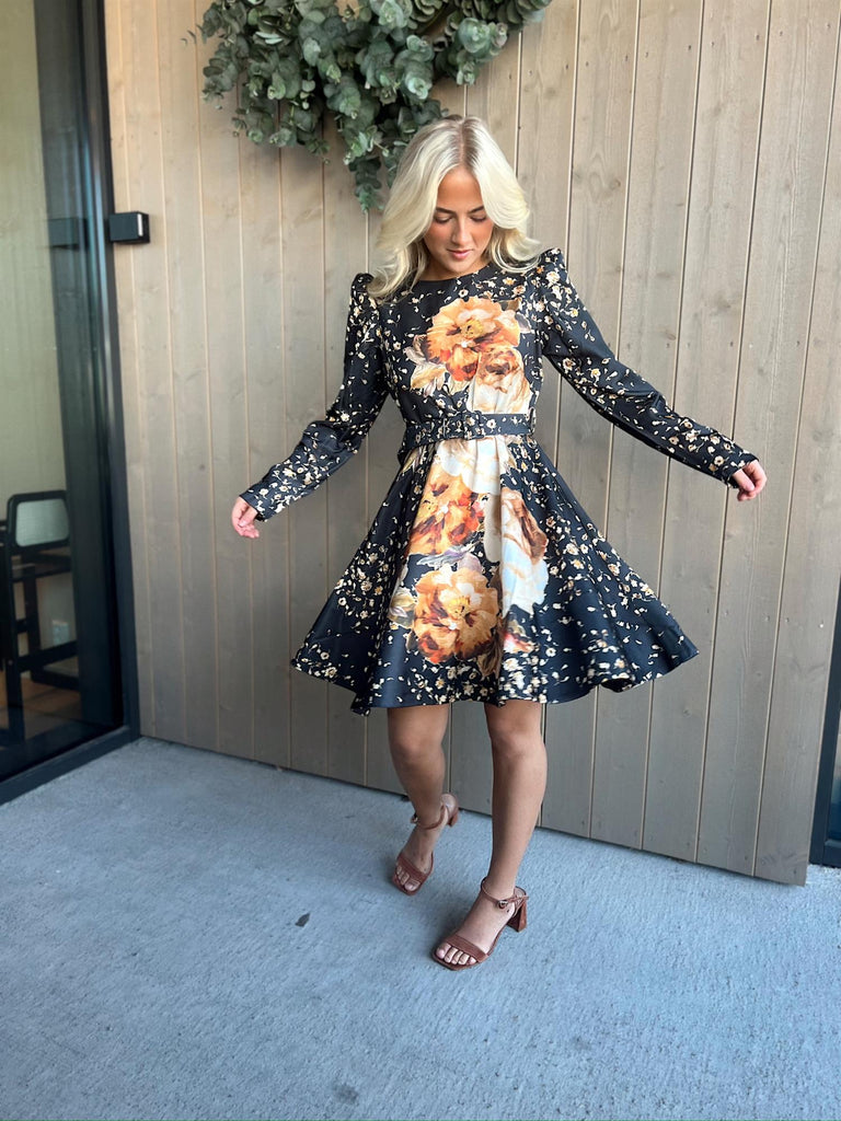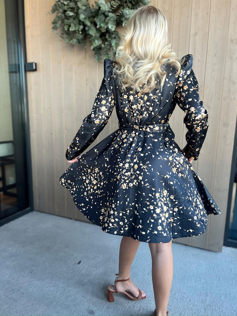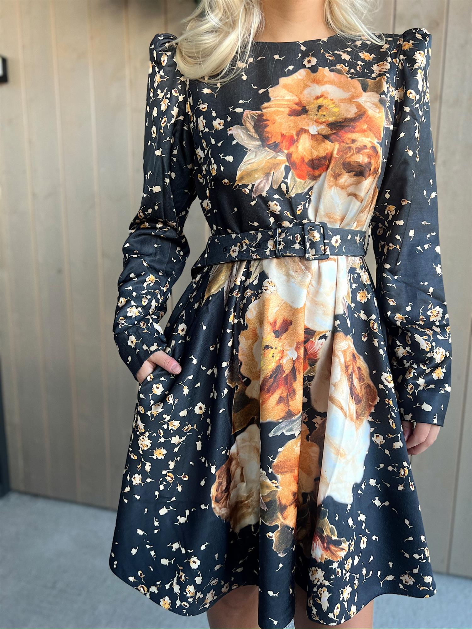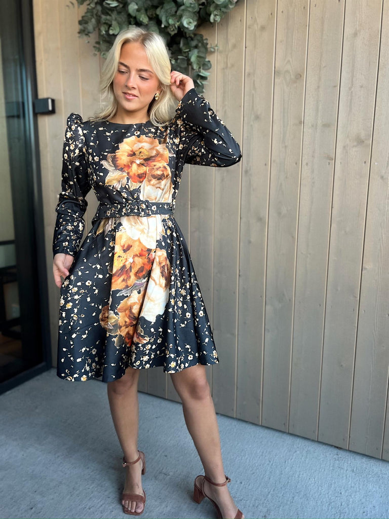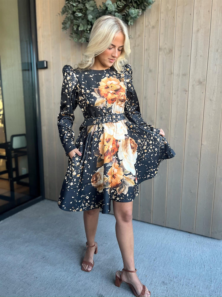 En elegant og feminin kjole i glansfull sateng med et vakkert, mørkt blomsterprint. Den har markert midje med belte, voluminøse ermer og et mykt fall som gir en flatterende silhuett. Kjolen er laget i en bærekraftig viskoseblanding og passer like godt til fest som til hverdags med et par enkle sko.