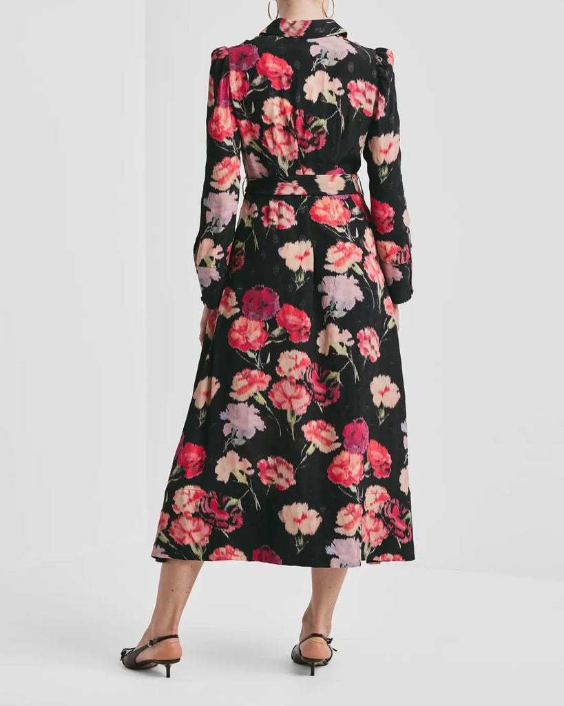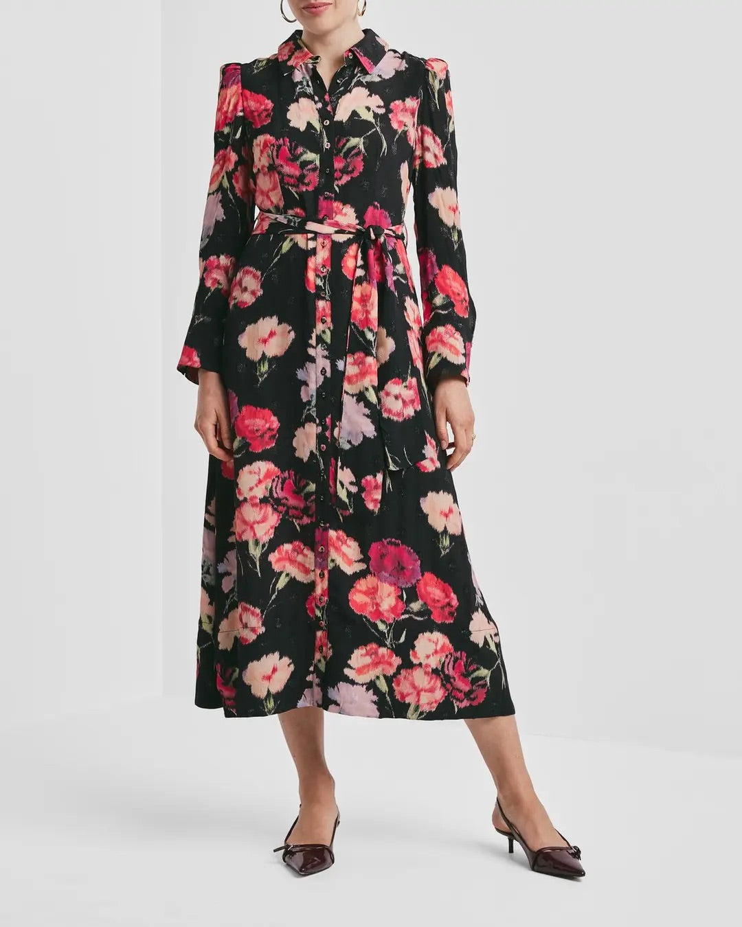 Elegant skjortekjole i myk, FSC-sertifisert viskose med en subtil glans. Kjolen har midi lengde, lange ermer med puffede skuldre og brede mansjetter, klassisk skjortekrage og knapper hele veien ned. Den kommer med et matchende knytebelte som fremhever midjen.