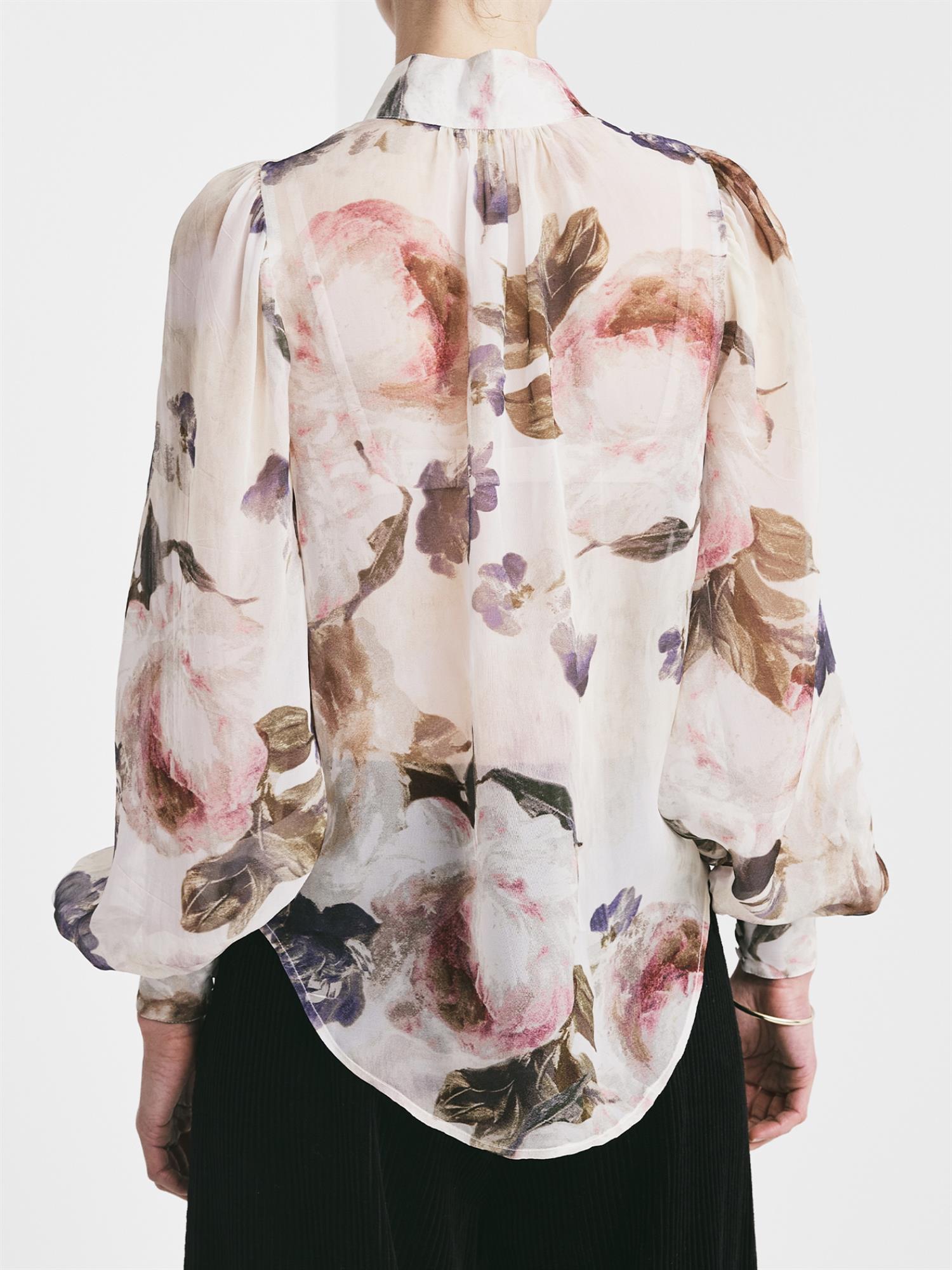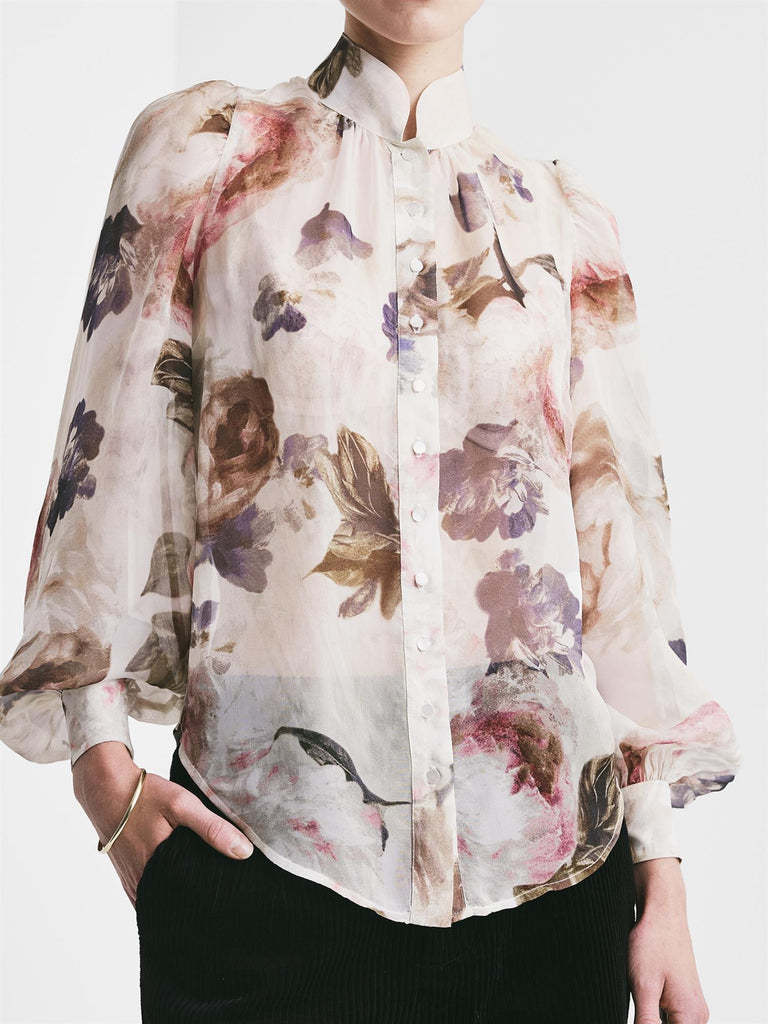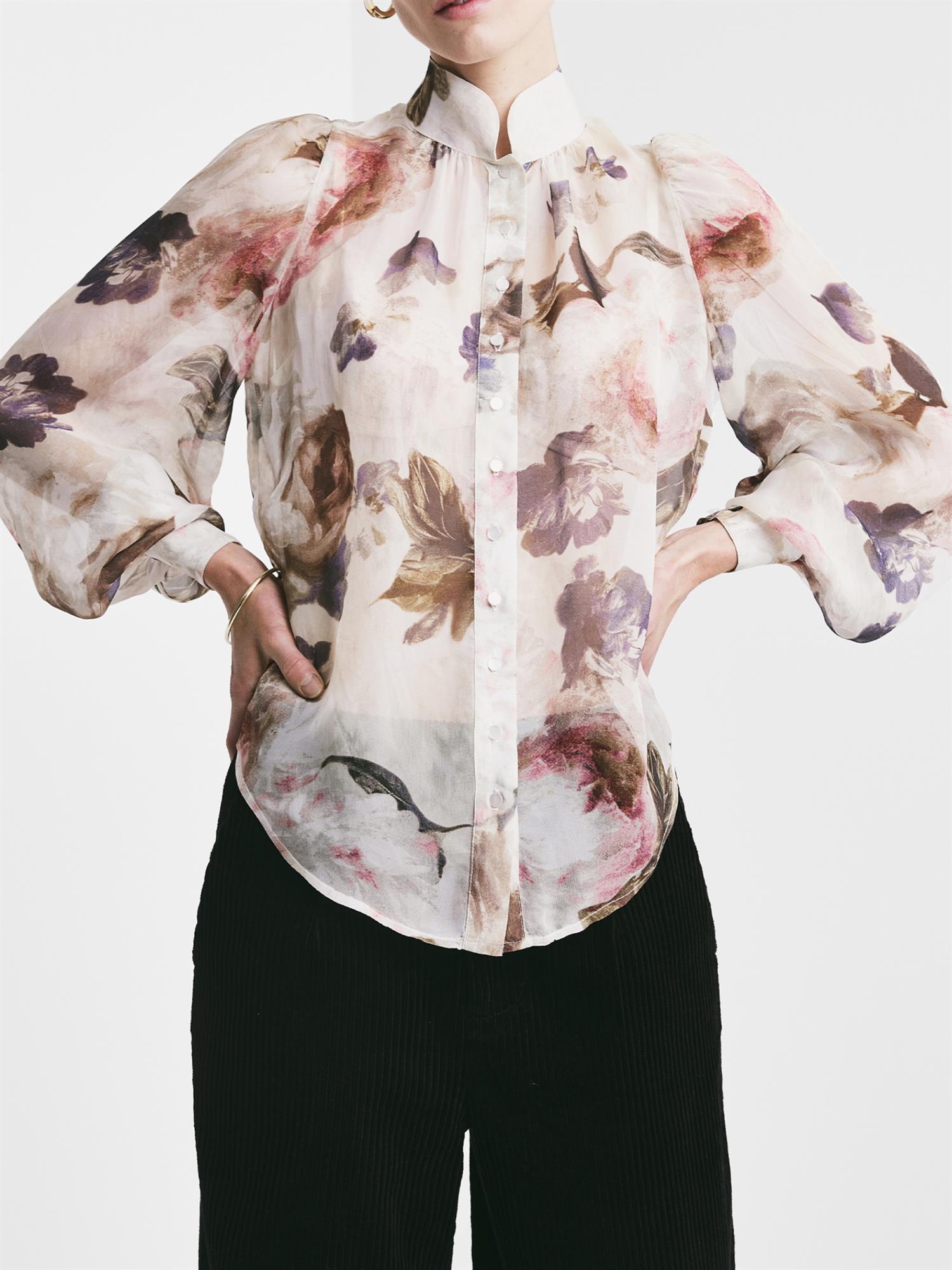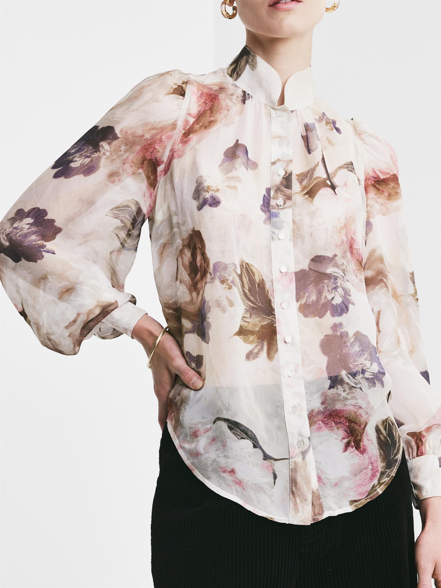 En feminin og elegant bluse i lett og luftig viskose, med delikat blomsterprint i myke nyanser. Den har høy krage med knappestolpe i front, romantiske ballongermer med mansjetter og en lett buet avslutning nederst.