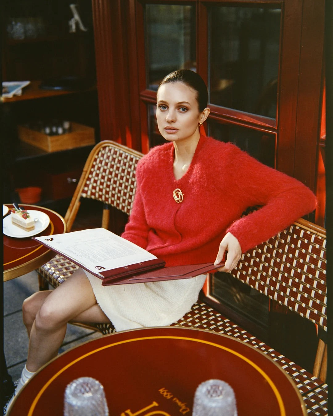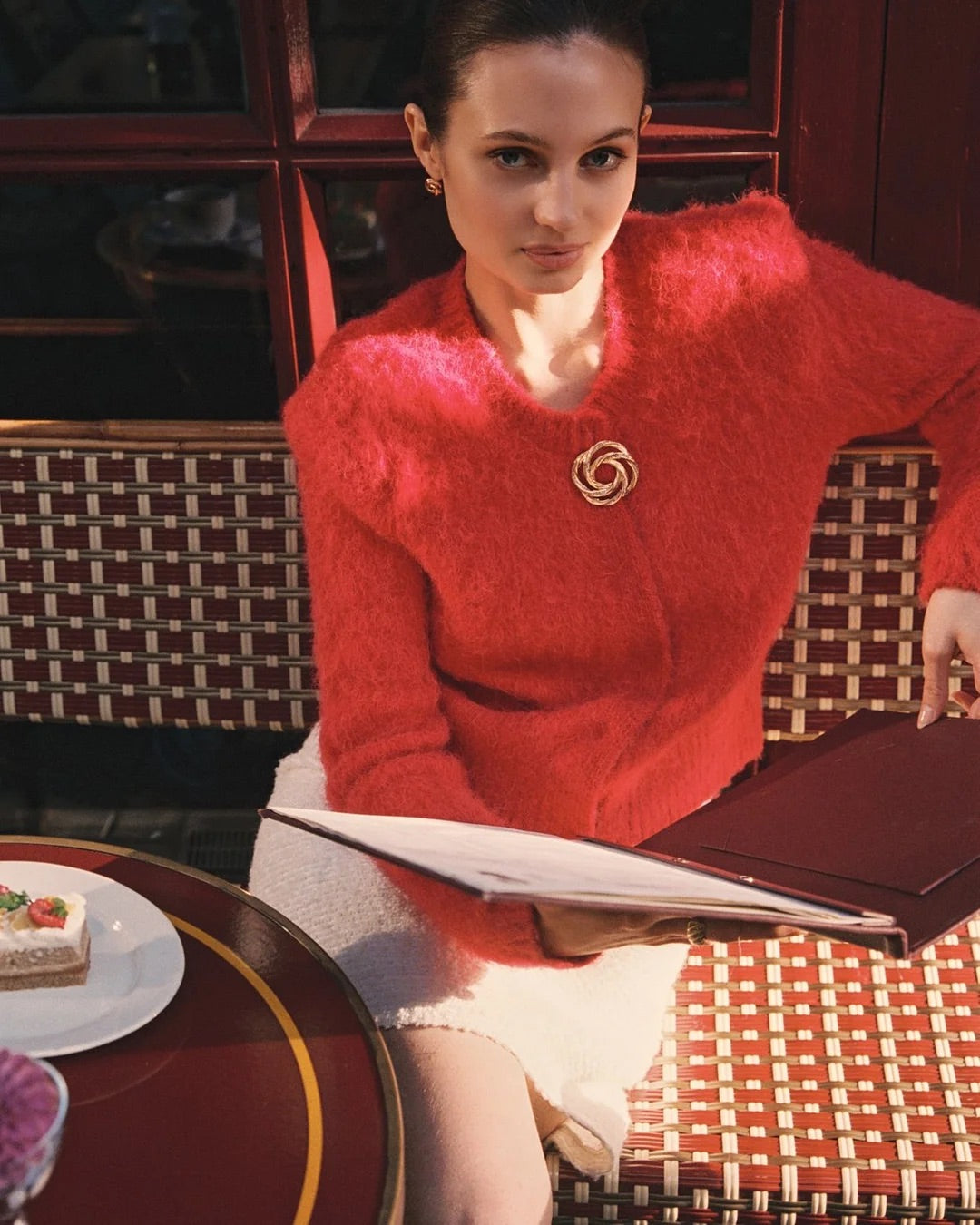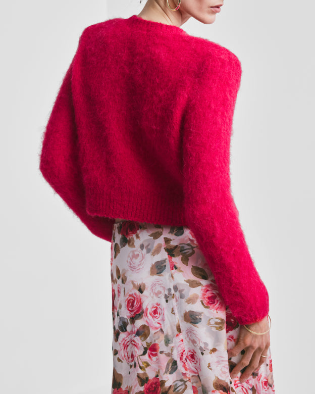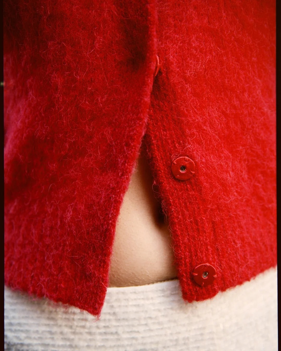 En myk og luksuriøs strikkejakke laget av en børstet alpakkablanding med RAS-sertifisert garn. Jakken har en rett silhuett, rund hals og lange ermer, med fine ribbestrikkede detaljer i hals, mansjetter og nederkant. Den lukkes foran med skjulte trykknapper for et rent og tidløst uttrykk.
