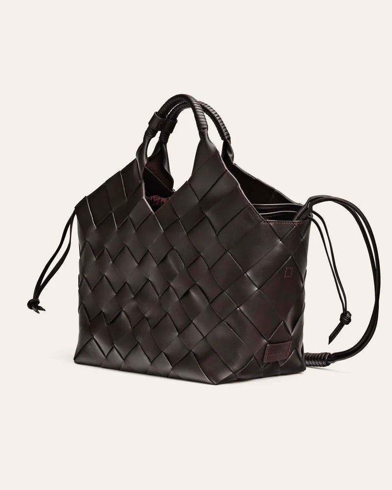 Den har to hanker og lukkes med magnet. Det følger med en skulderstropp og en tøypose som kan fjernes.