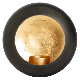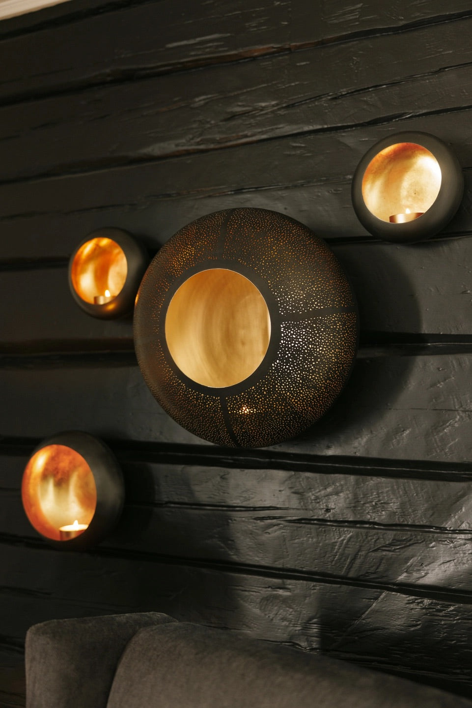 Når lyset tennes, reflekteres den gyldne innsiden og sprer en lun glød på veggen – perfekt for å sette et stemningsfullt preg i stuen, gangen eller soverommet. Den harmoniske kontrasten mellom det mørke metallet og det varme gullet gjør lysholderne til et dekorativt element i seg selv – både med og uten lys.