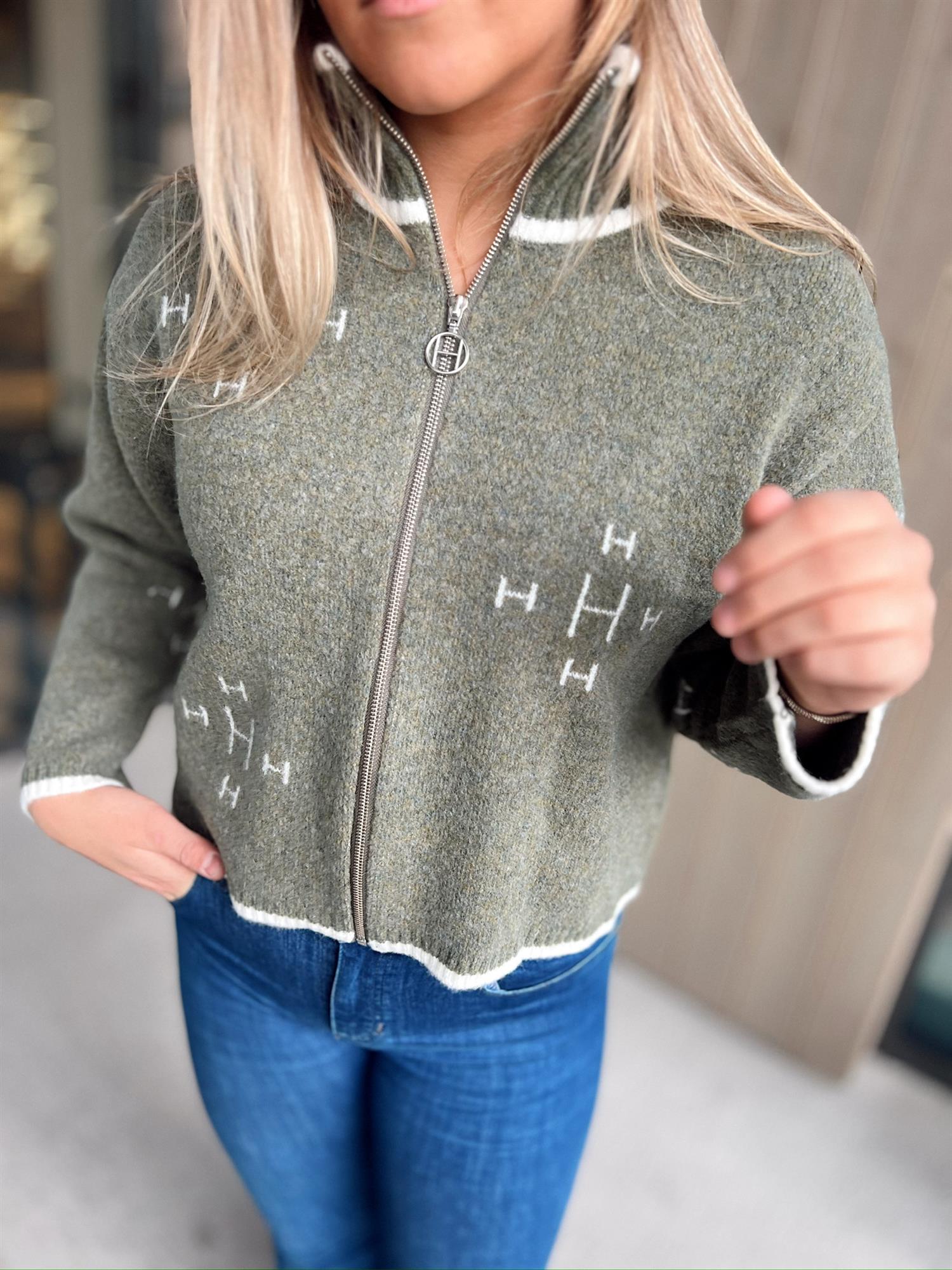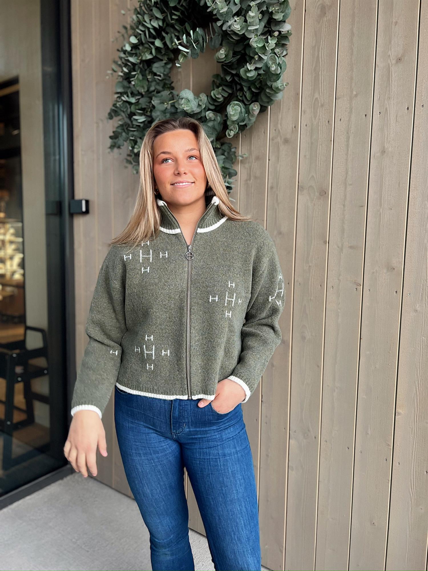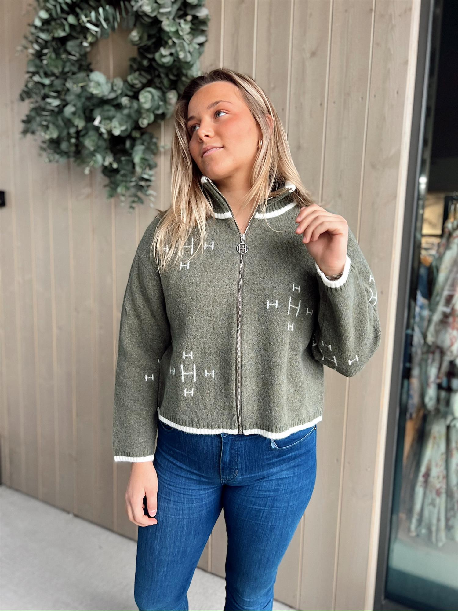 Jakke med zip. Genseren har noe vide ermer, høy hals (ribbekant), smal ribbekant nederst på genser og nederst på ermet. Jakken er en normal til kort modell.