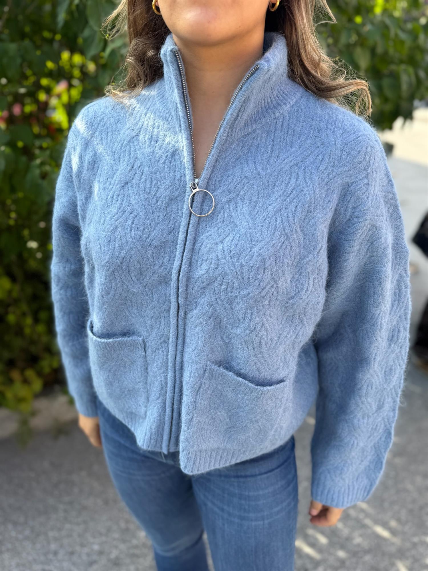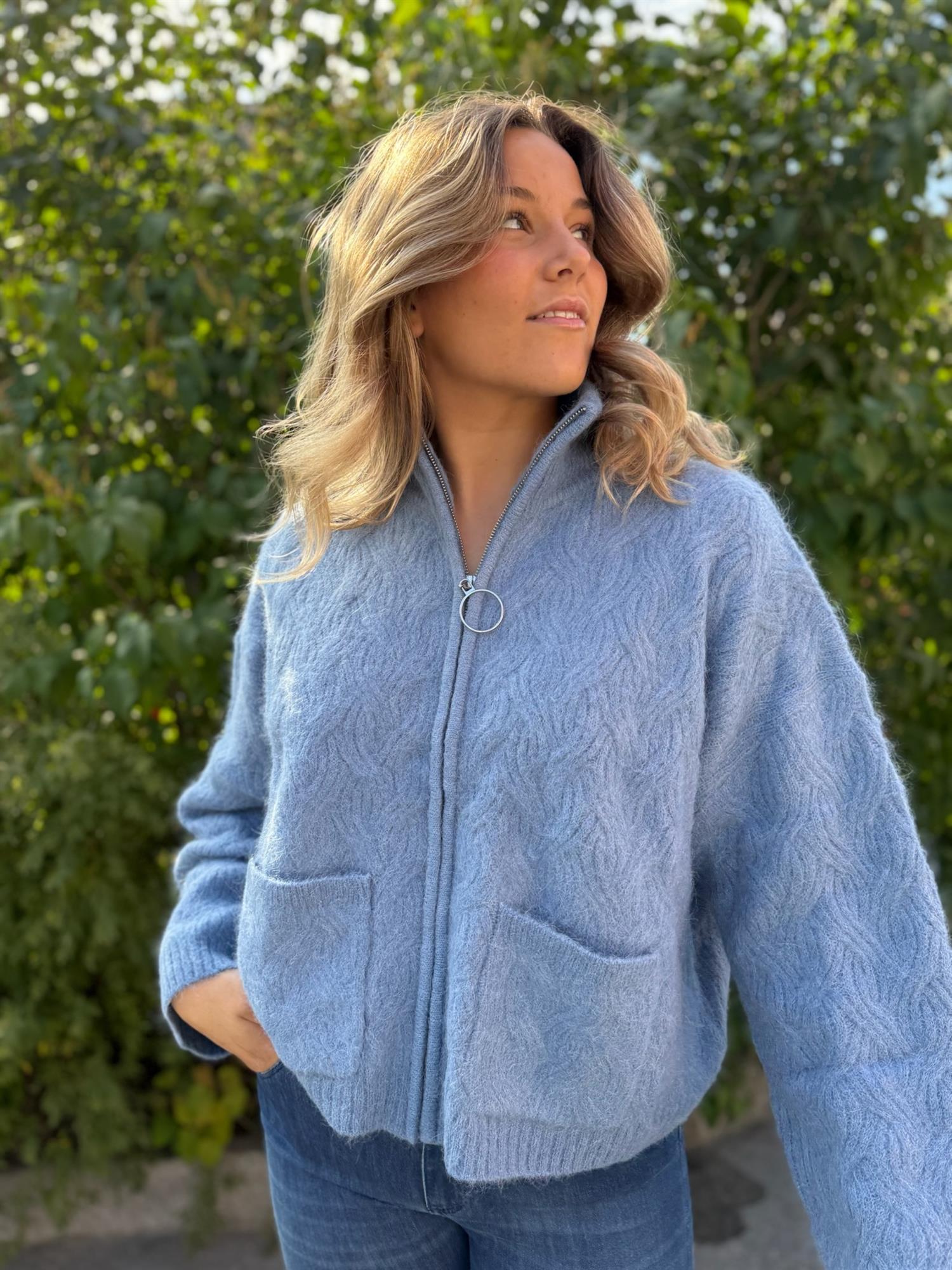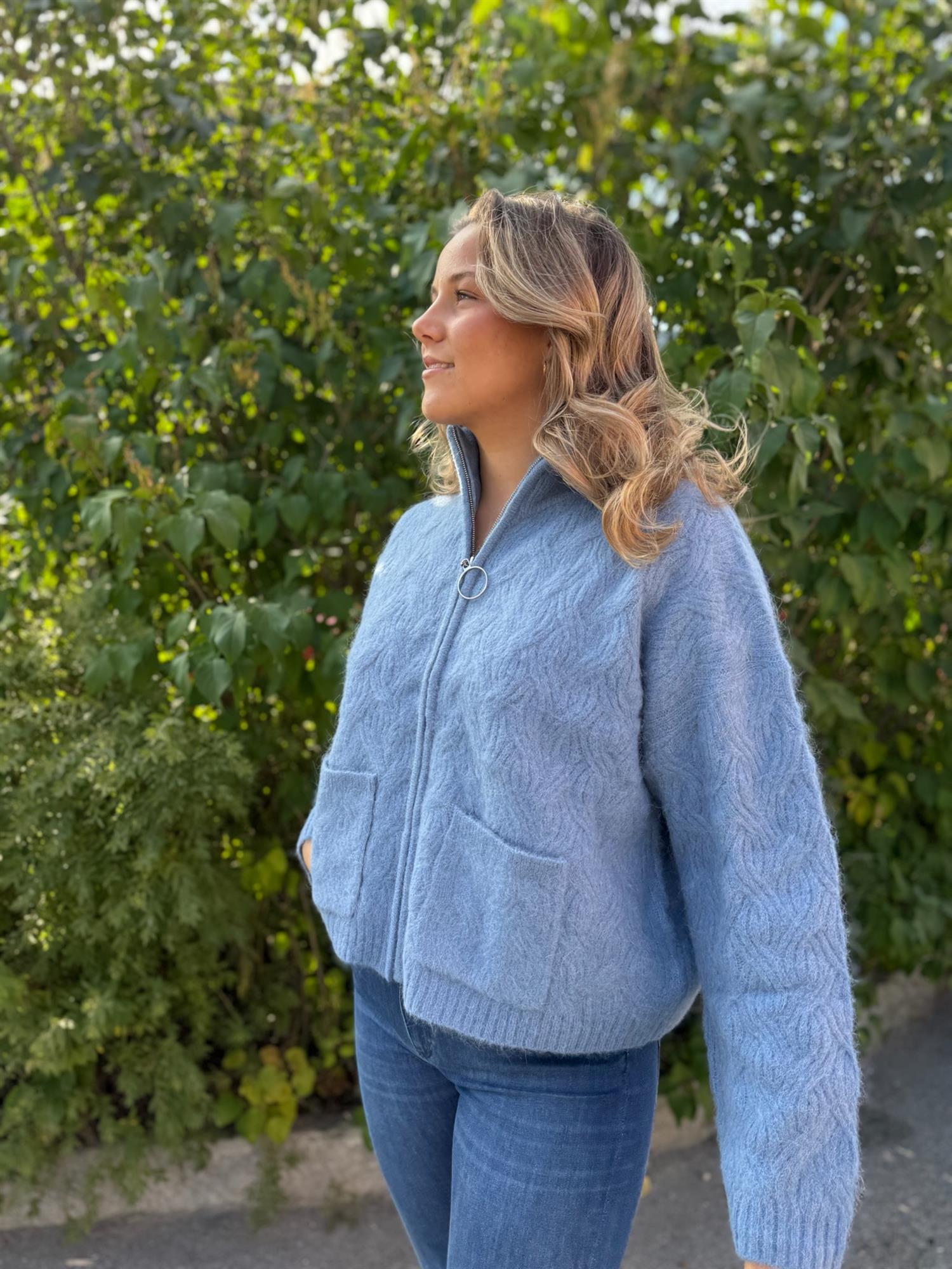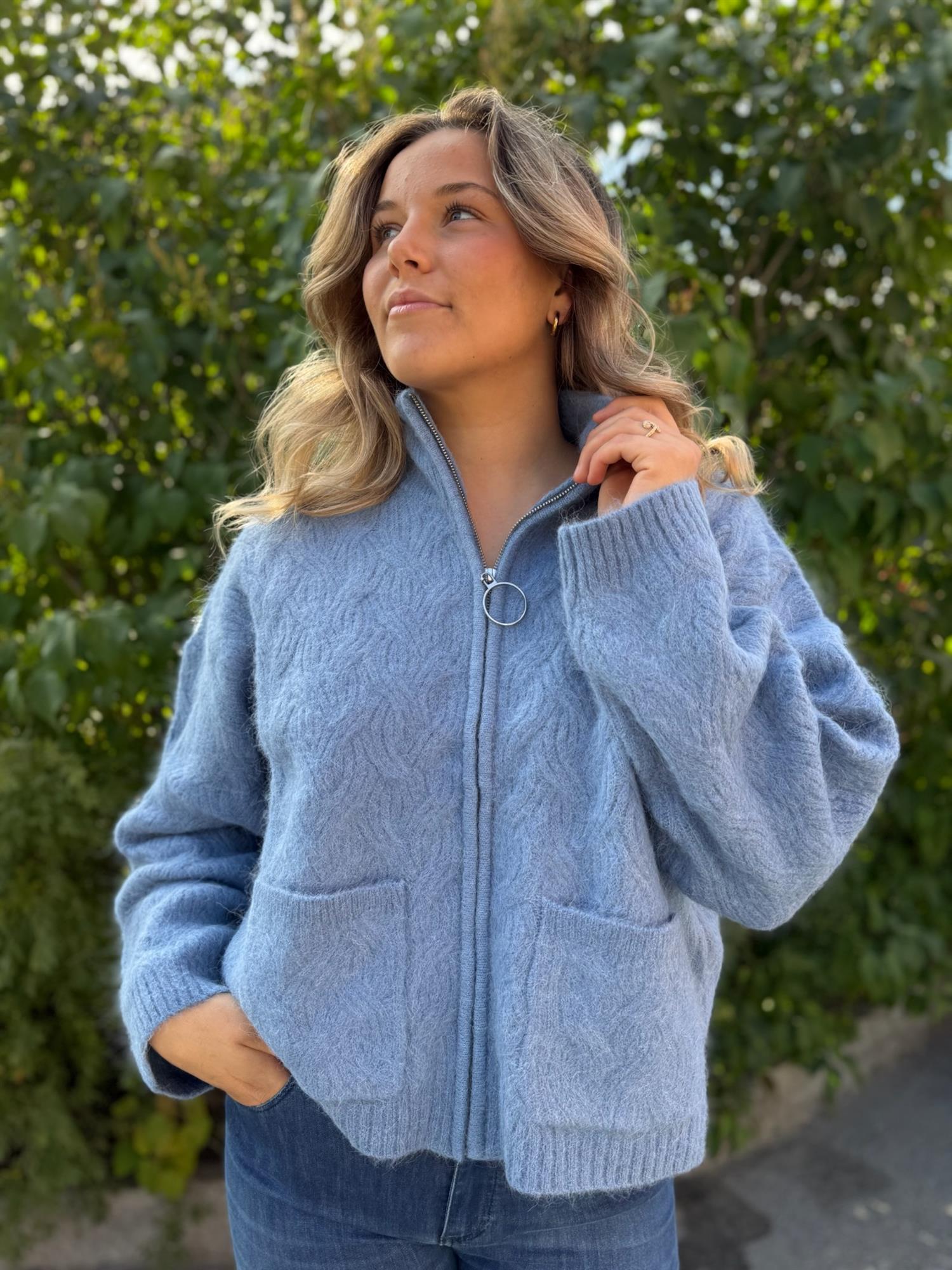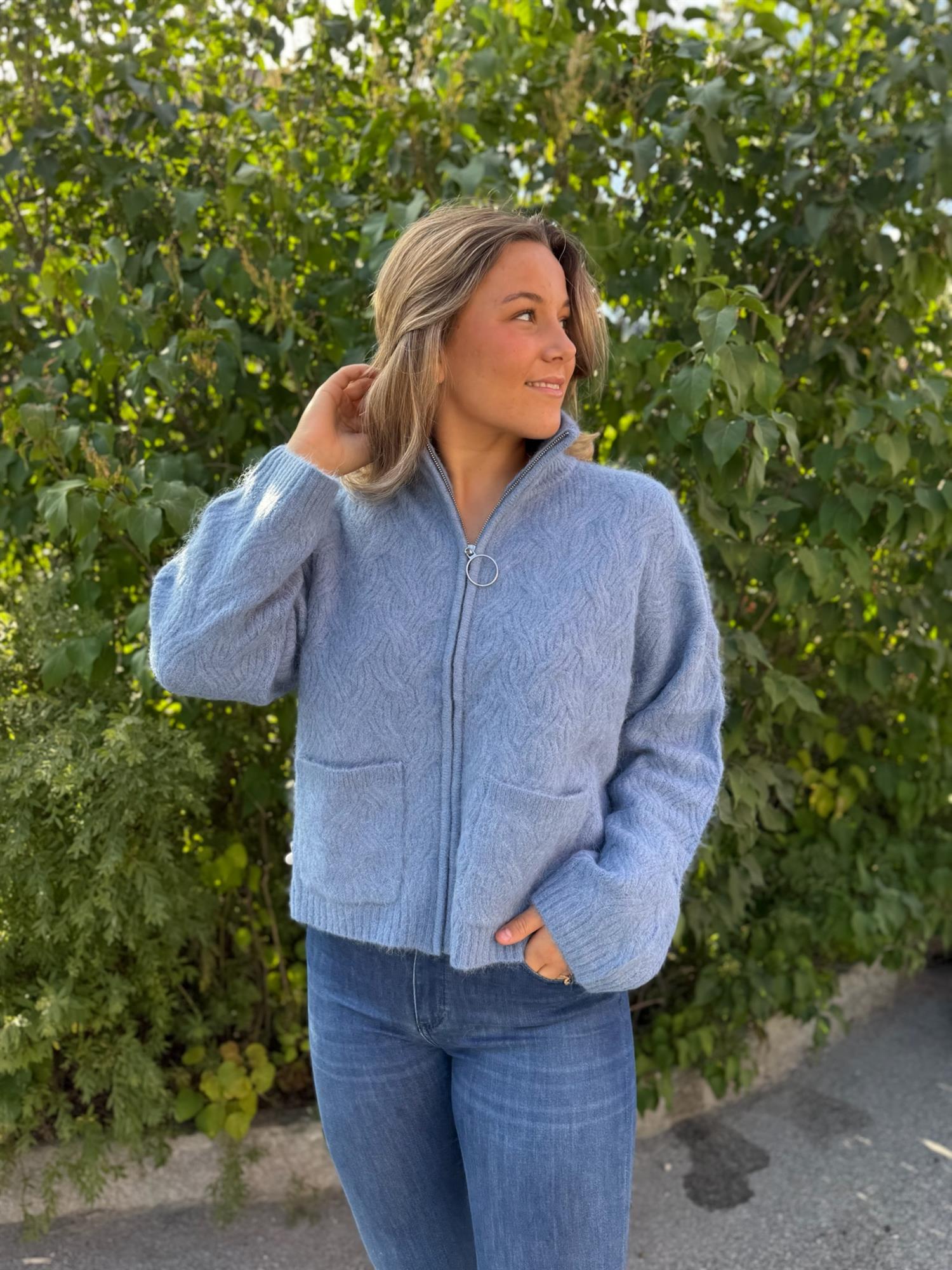 En myk og varm cardigan i en lett, ullblanding med et delikat, strukturert mønster. Cardiganen har høy, ribbestrikket hals med glidelås og to praktiske lommer foran. Ribbestrikk nederst på ermene og i livet gir en fin og behagelig passform. Den korte lengden gjør den perfekt til både jeans og skjørt, og den dempede fargen gir et tidløst og elegant uttrykk.