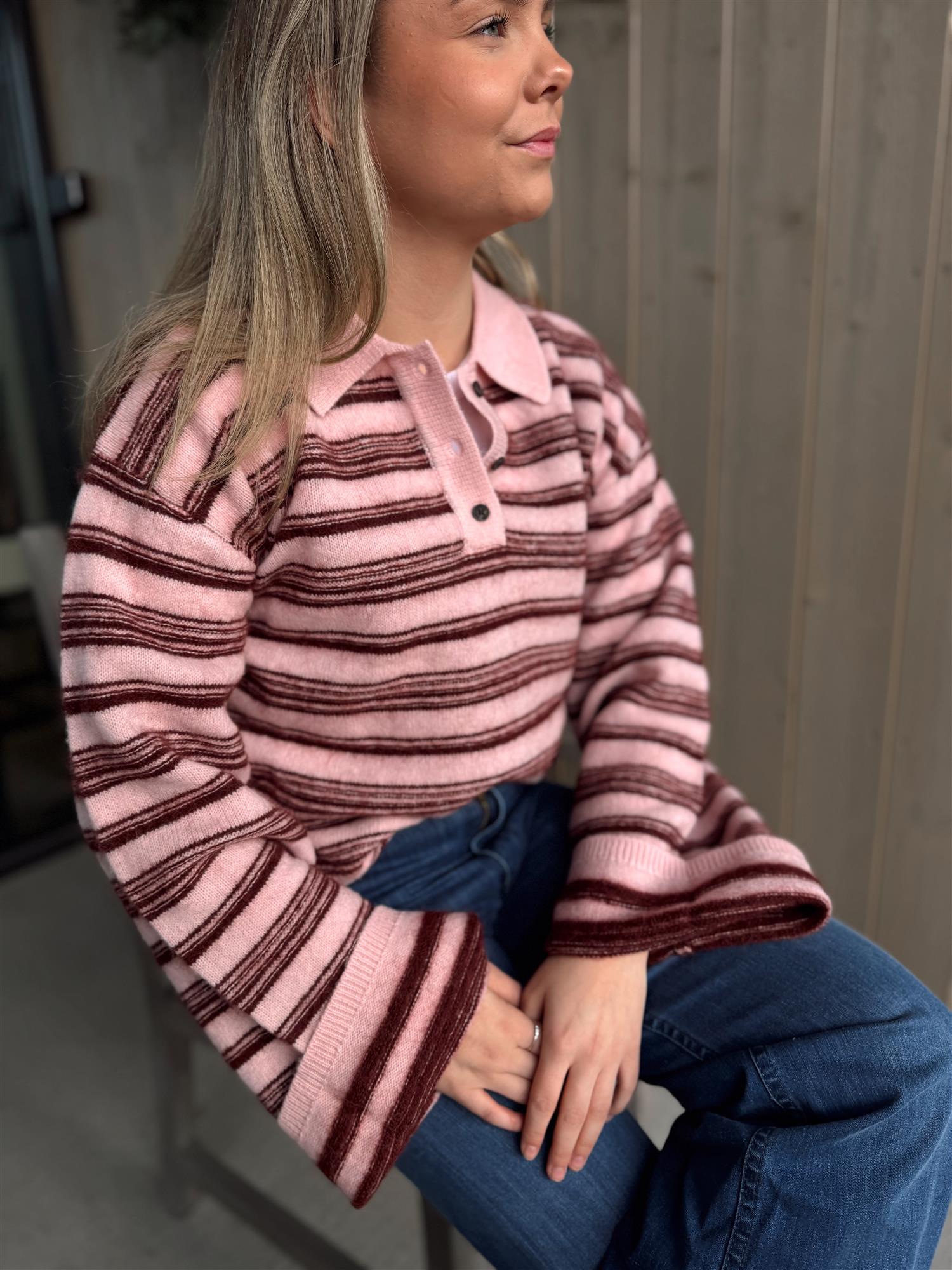 Olivia Wool Polo 26-01 er en stilren og komfortabel genser laget av en taktil stripete strikk. Den har en avslappet passform, en knappet polo-krage og klokkeermer, noe som gir et elegant preg til antrekket.