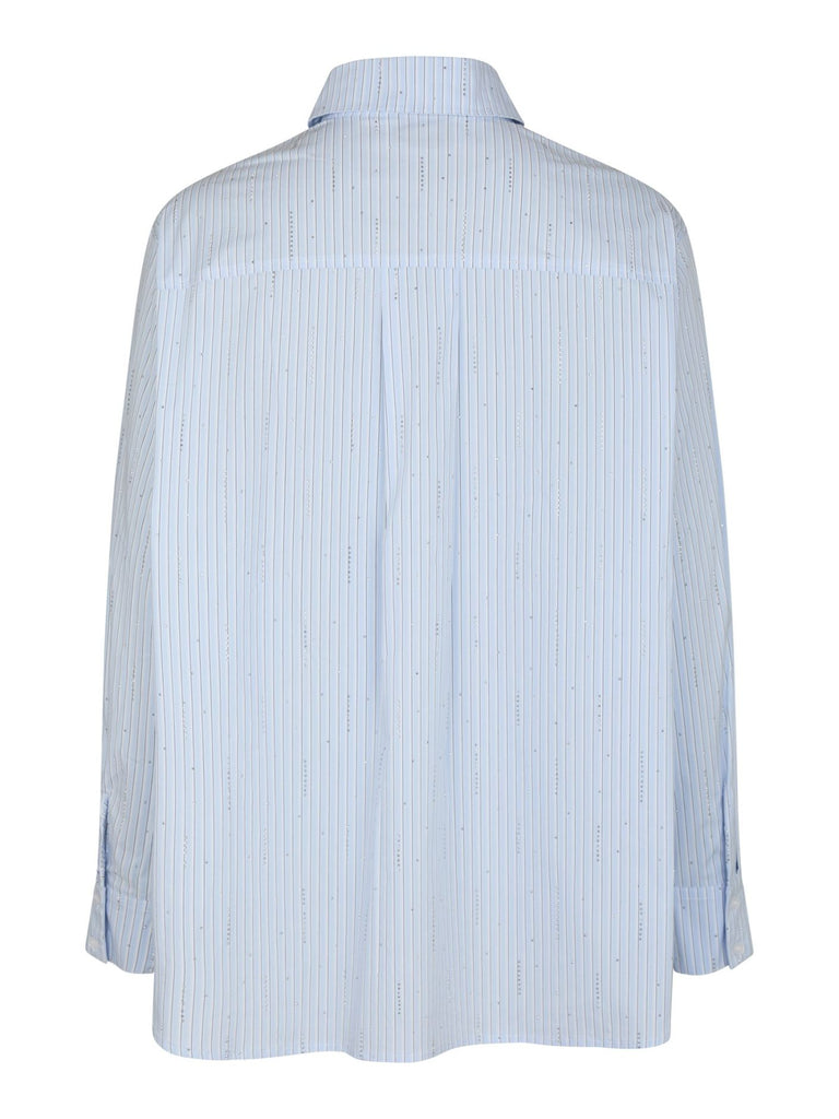 En statement-skjorte med oversized passform og unike detaljer. Skjorten kommer i en delikat stripet kvalitet med dekorative steiner som gir et moderne og eksklusivt uttrykk. Et kult plagg som enkelt løfter ethvert antrekk – perfekt til både hverdag og styling.