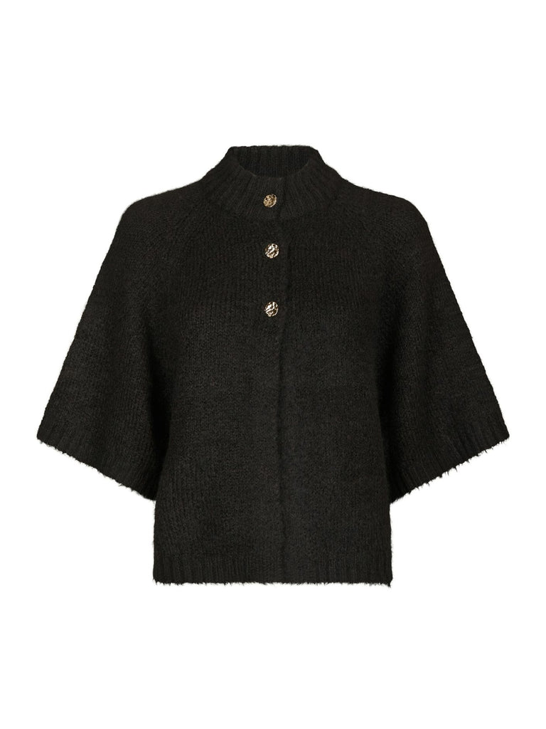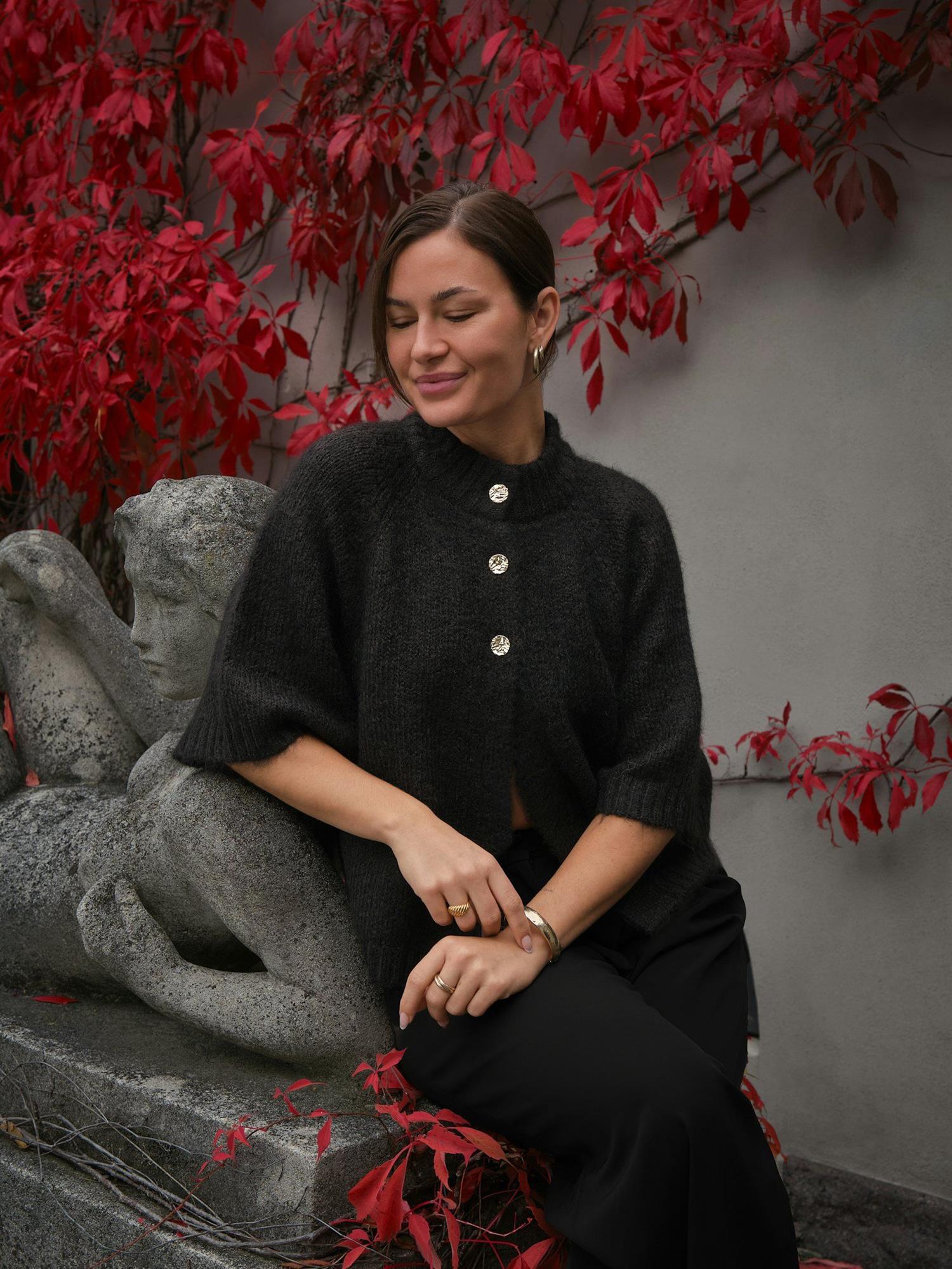En moderne, boksformet strikkegenser med vide ermer og dekorative knapper foran som gir et feminint og trendy uttrykk. Kvaliteten er myk og behagelig med et fluffy utseende som passer perfekt til høst- og vintersesongen. En allsidig genser som enkelt kan styles både til hverdags og jobb.