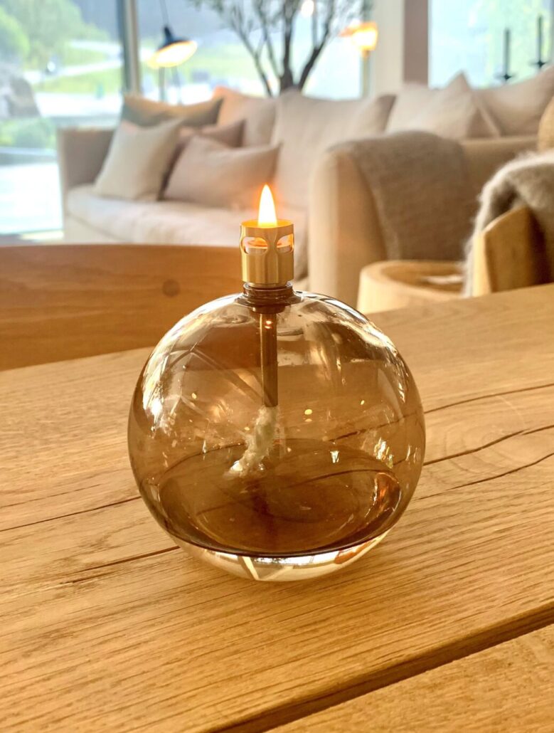 Fylles på med olje etter bruk. Olje kjøpes separat. Anbefaler også å kjøpe tilhørende trakt for fylling av olje på lampene.