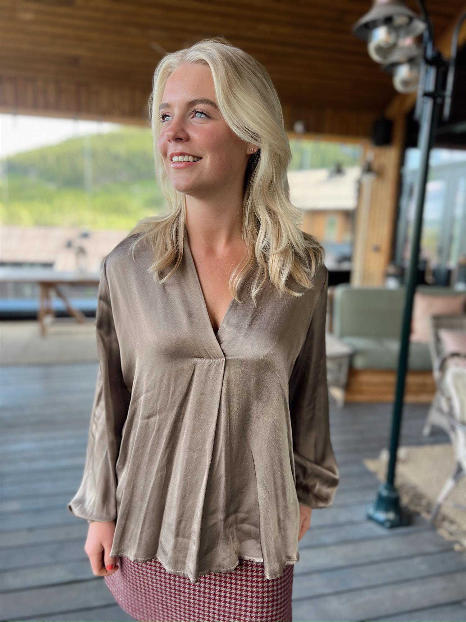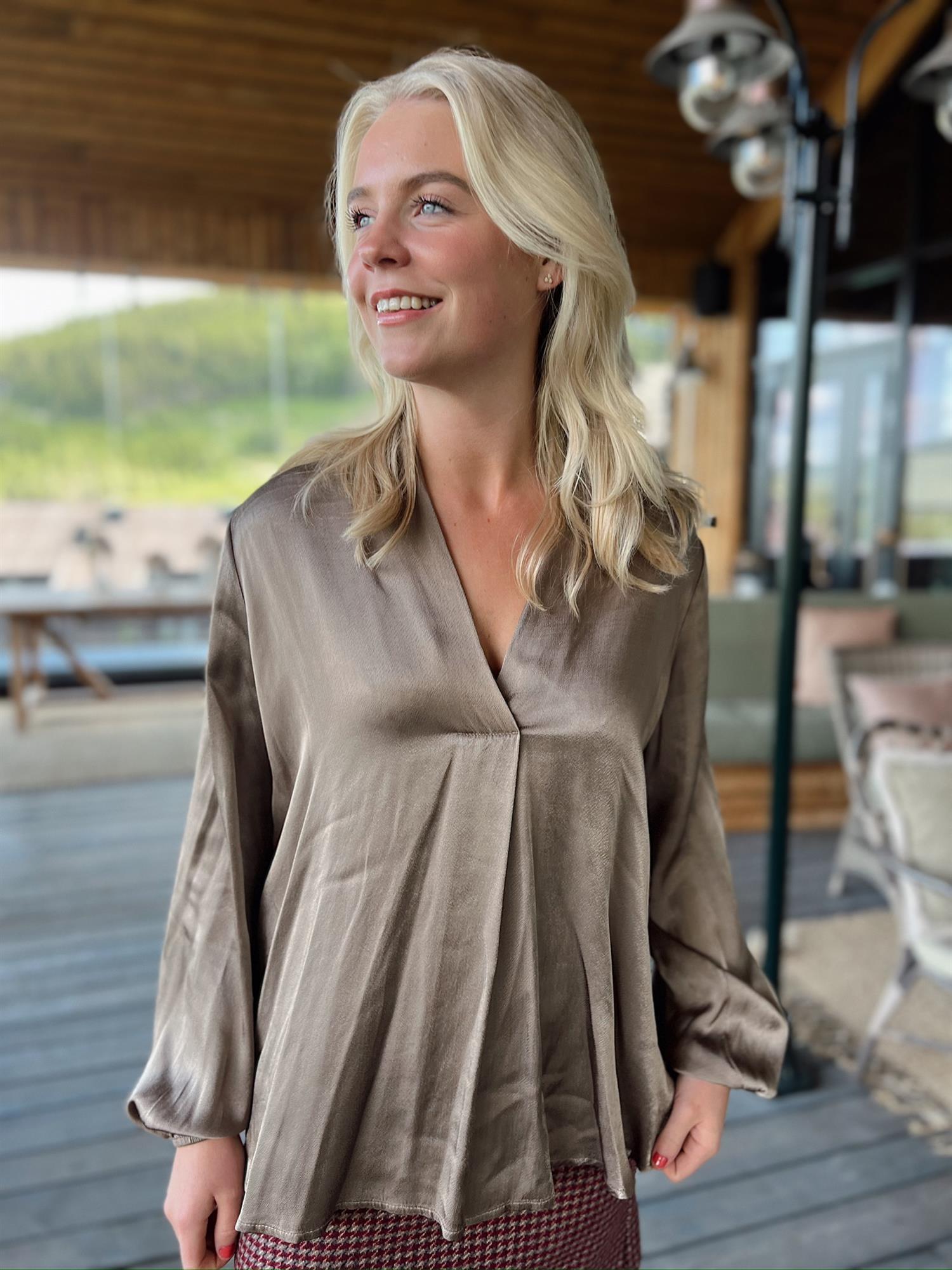 Blusen har V-utringning, lange ermer med elastikk nederst og en delikat leggdetalj i front som gir ekstra bevegelse og liv til stoffet. Et feminint, men nedtonet uttrykk som passer like godt til jeans som til dressbukser.