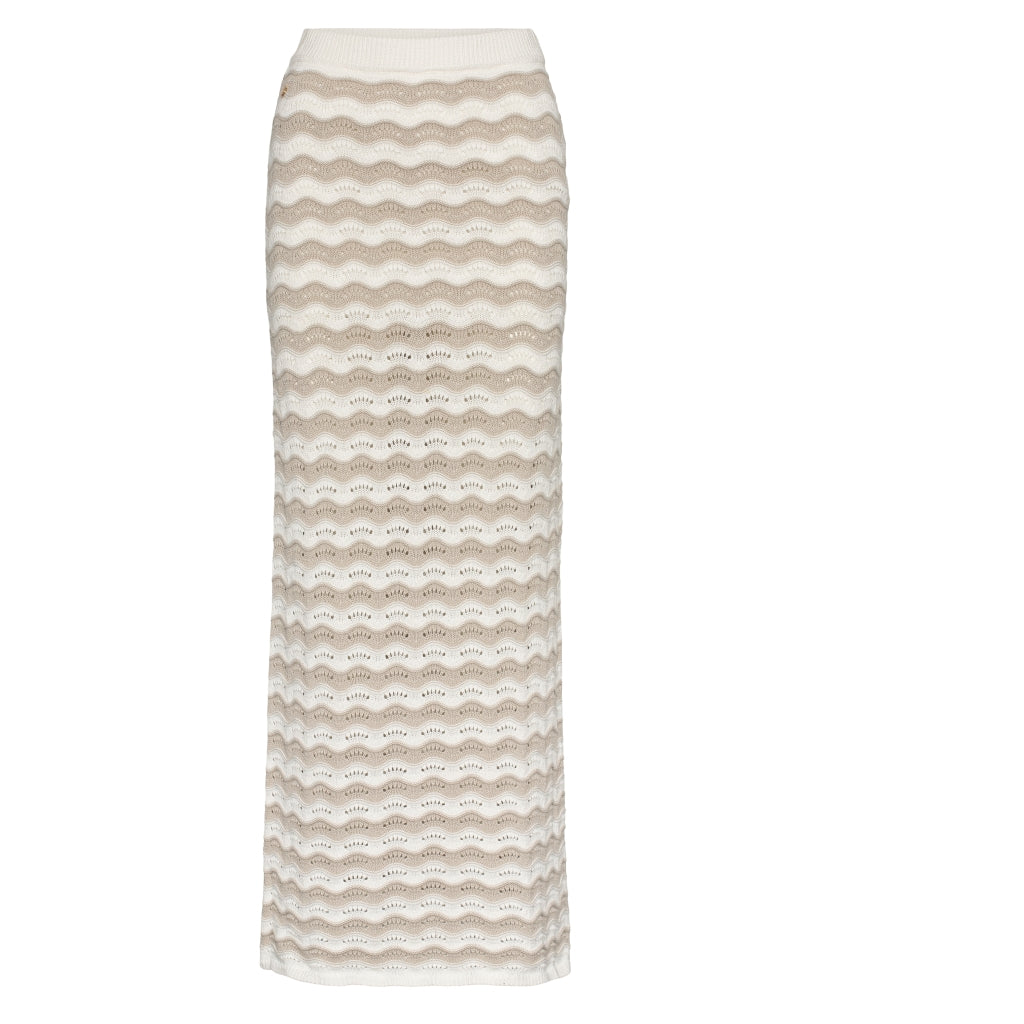 Et elegant og tidløst ribbestrikket skjørt i 100 % bomull. Skjørtet har elastisk midje for god komfort, splitter i sidene som gir fin bevegelse og et kort underskjørt i bomull for ekstra dekning. Det dekorative strikkemønsteret gir et eksklusivt uttrykk – perfekt alene eller stylet med matchende topp eller cardigan.