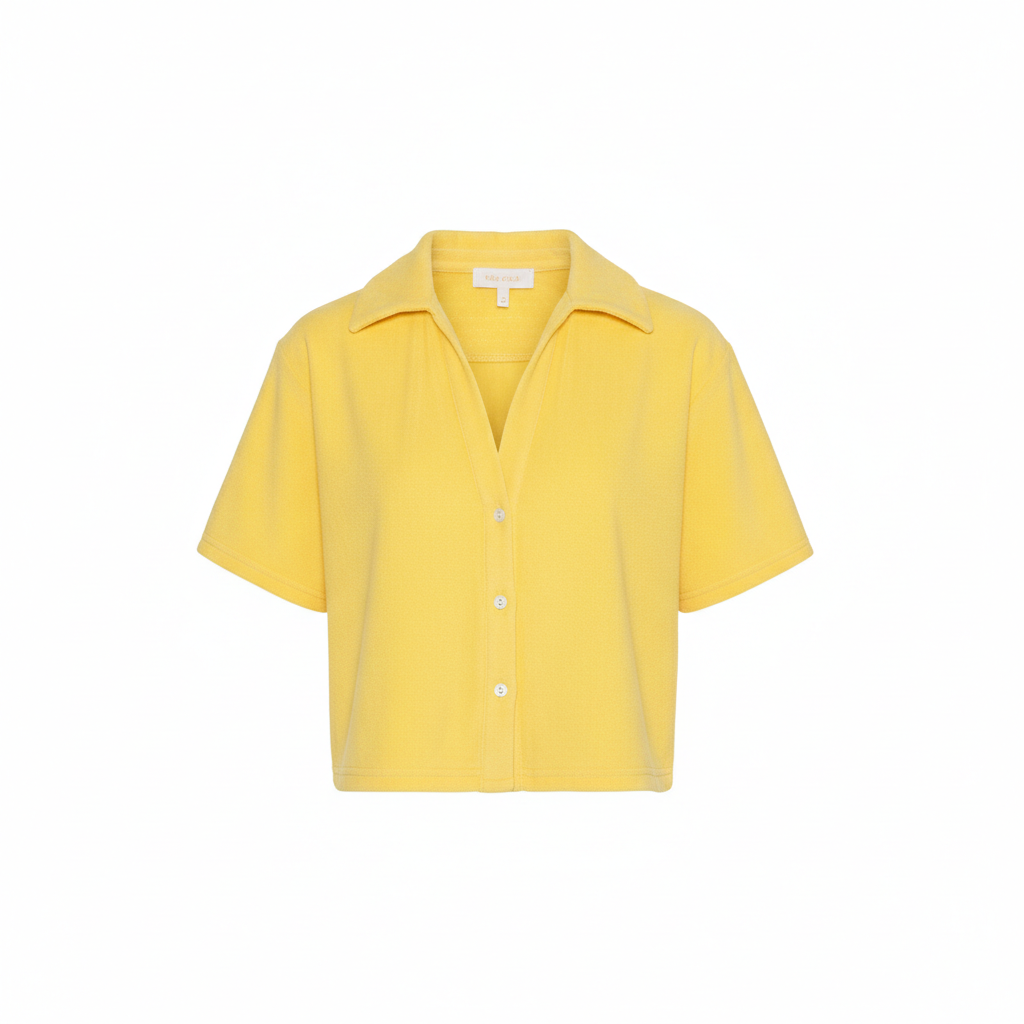 En søt og sommerlig topp i myk frotté med gjennomtenkte detaljer. Toppen har knepping i front, krage og v-hals som gir et feminint, men avslappet uttrykk. Smock-strikk øverst bak i ryggen sørger for god passform og komfort, mens den korte fasongen gjør den perfekt til varme sommerdager.