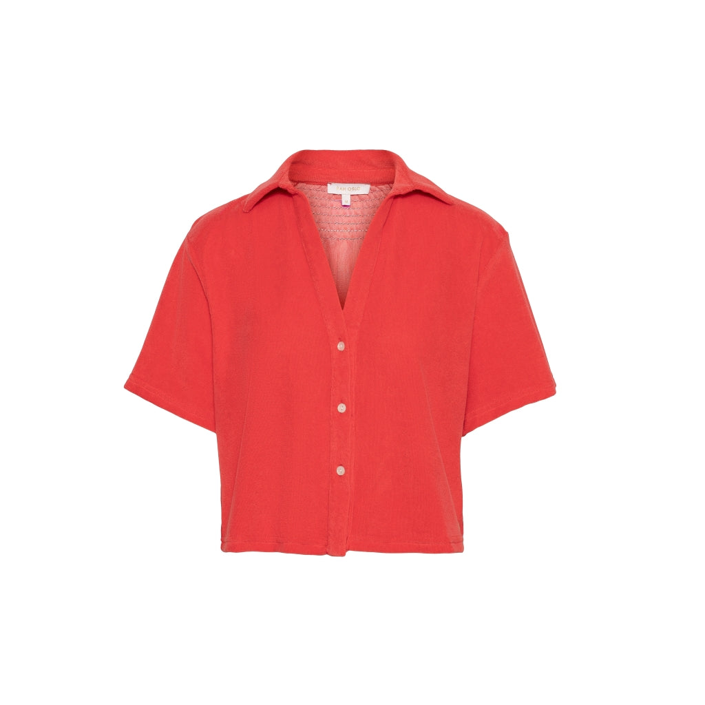 En søt og sommerlig topp i myk frotté med gjennomtenkte detaljer. Toppen har knepping i front, krage og v-hals som gir et feminint, men avslappet uttrykk. Smock-strikk øverst bak i ryggen sørger for god passform og komfort, mens den korte fasongen gjør den perfekt til varme sommerdager.