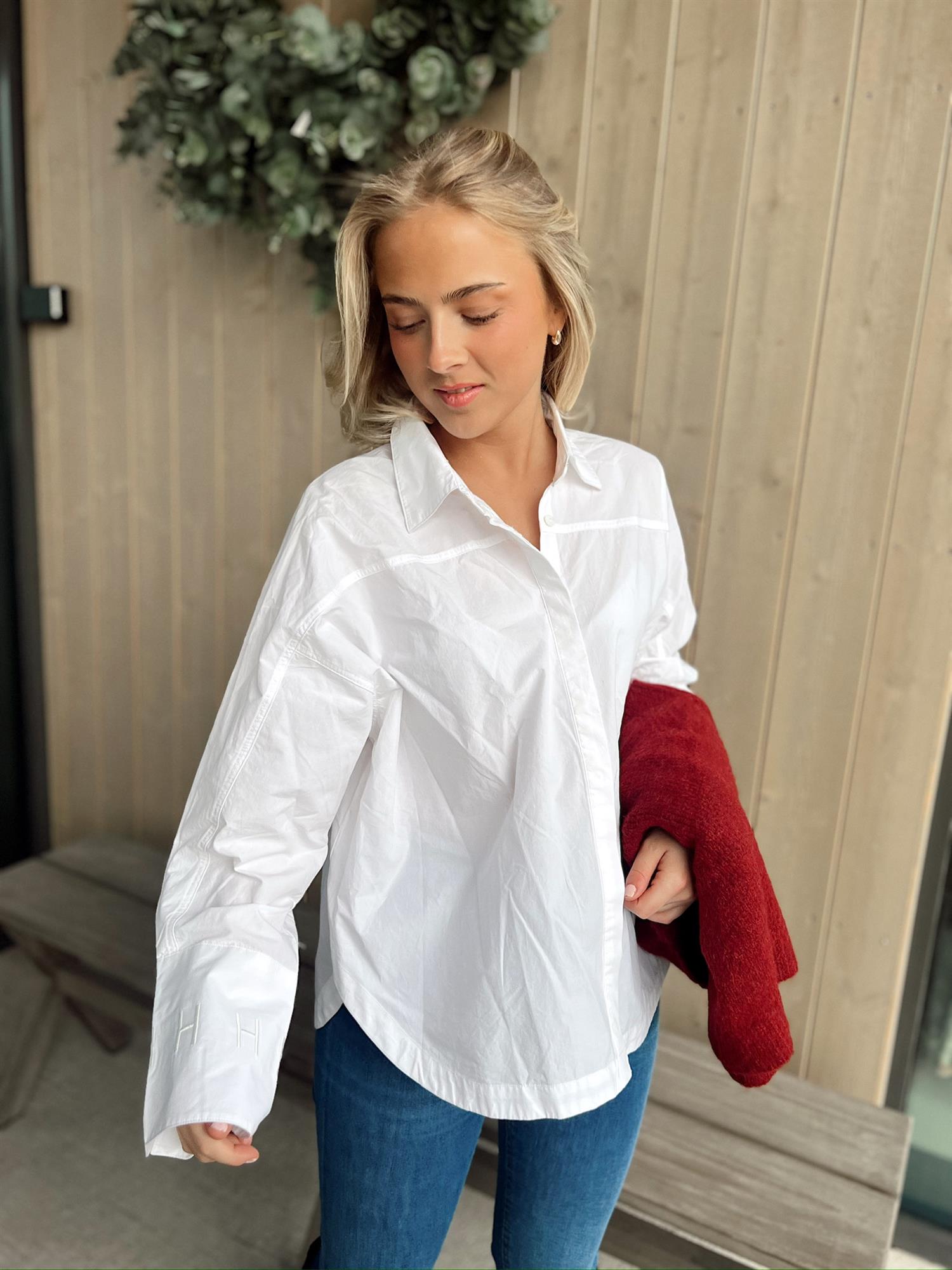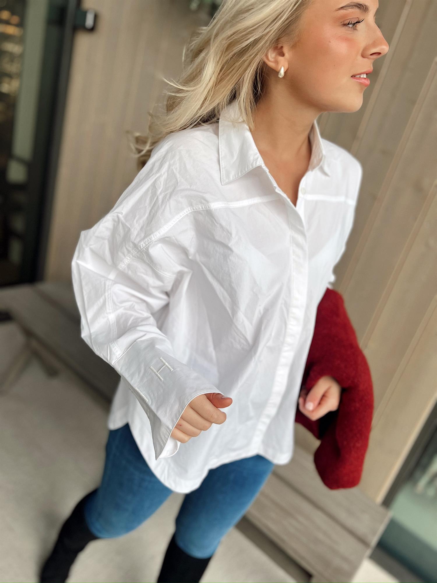 Senna Shirt er en oversized skjorte laget i 100% bomullspoplin. Den har et subtilt H-broderi på mansjettene og nederst bak som gir en diskret detalj. En stilig og avslappet skjorte som kombinerer tidløs eleganse med moderne uttrykk.