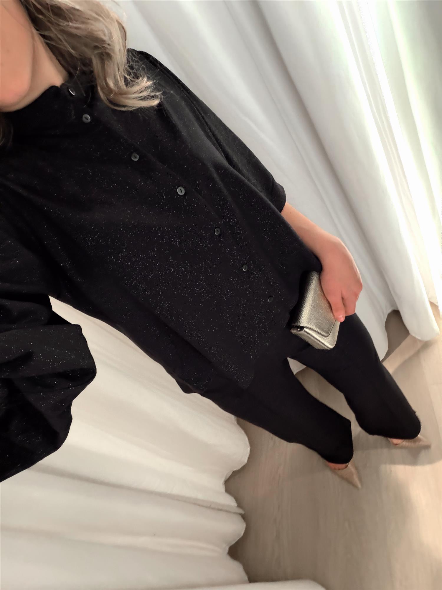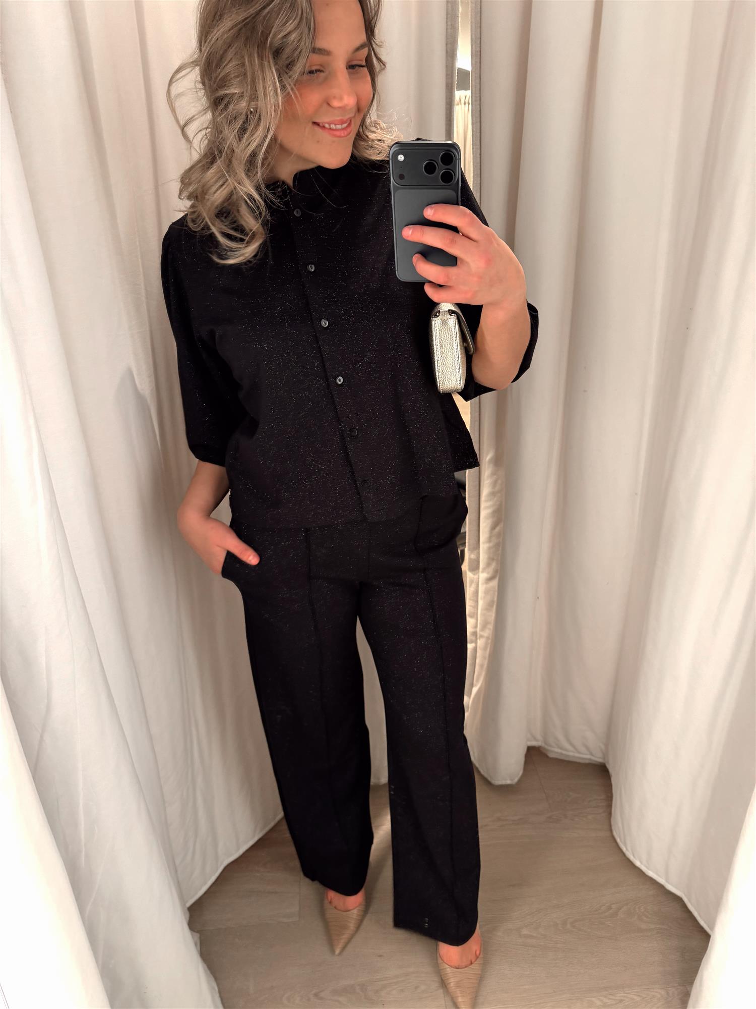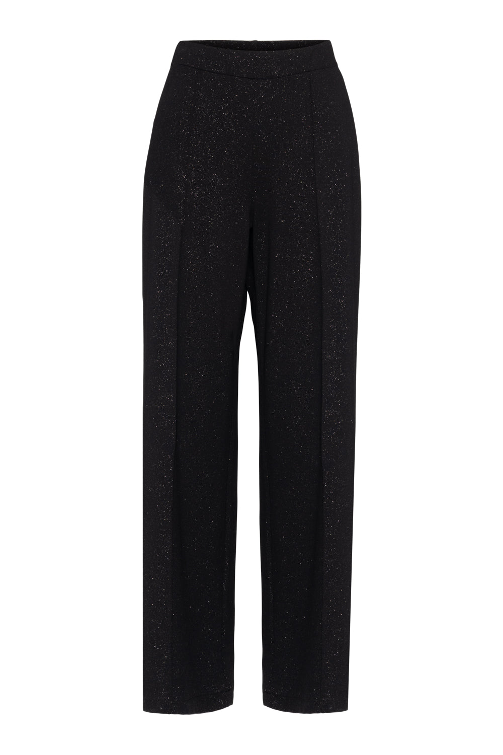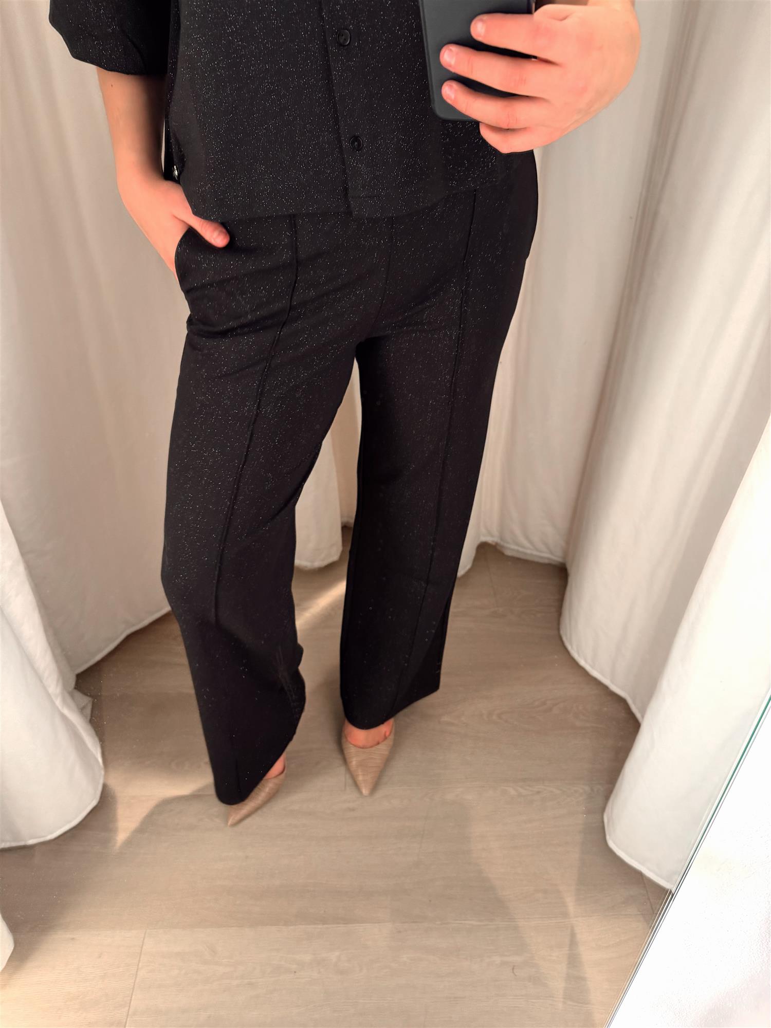 Den er laget i en myk og stretchy viskosemiks med et subtilt glitter i stoffet som tilfører en diskré, sofistikert glød. En perfekt bukse både til hverdags og fest – like fin med en enkel topp som med en pen bluse.