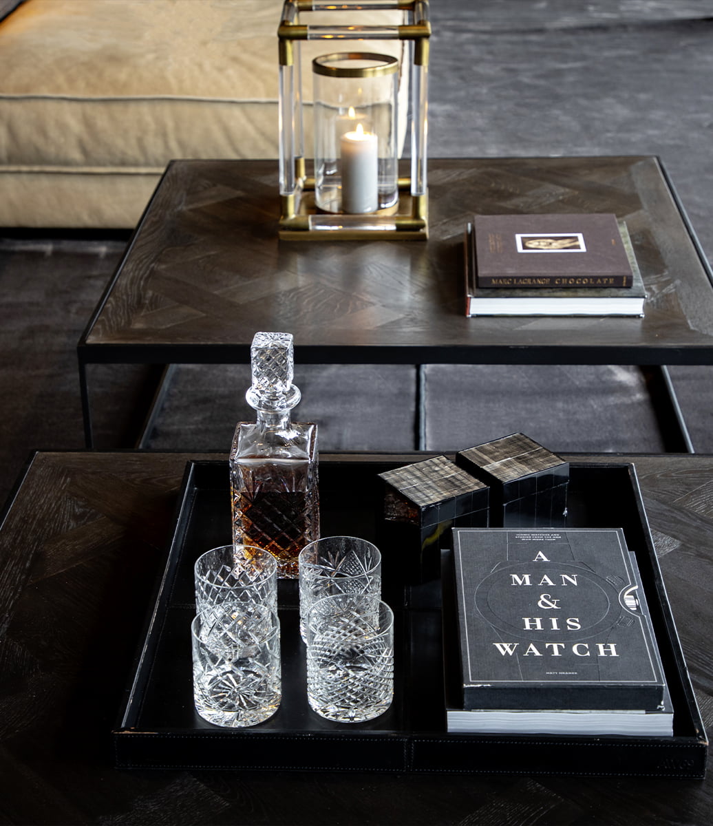 Serien inkluderer salongbord, mediabenk, sidebord og konsollbord med hyller.