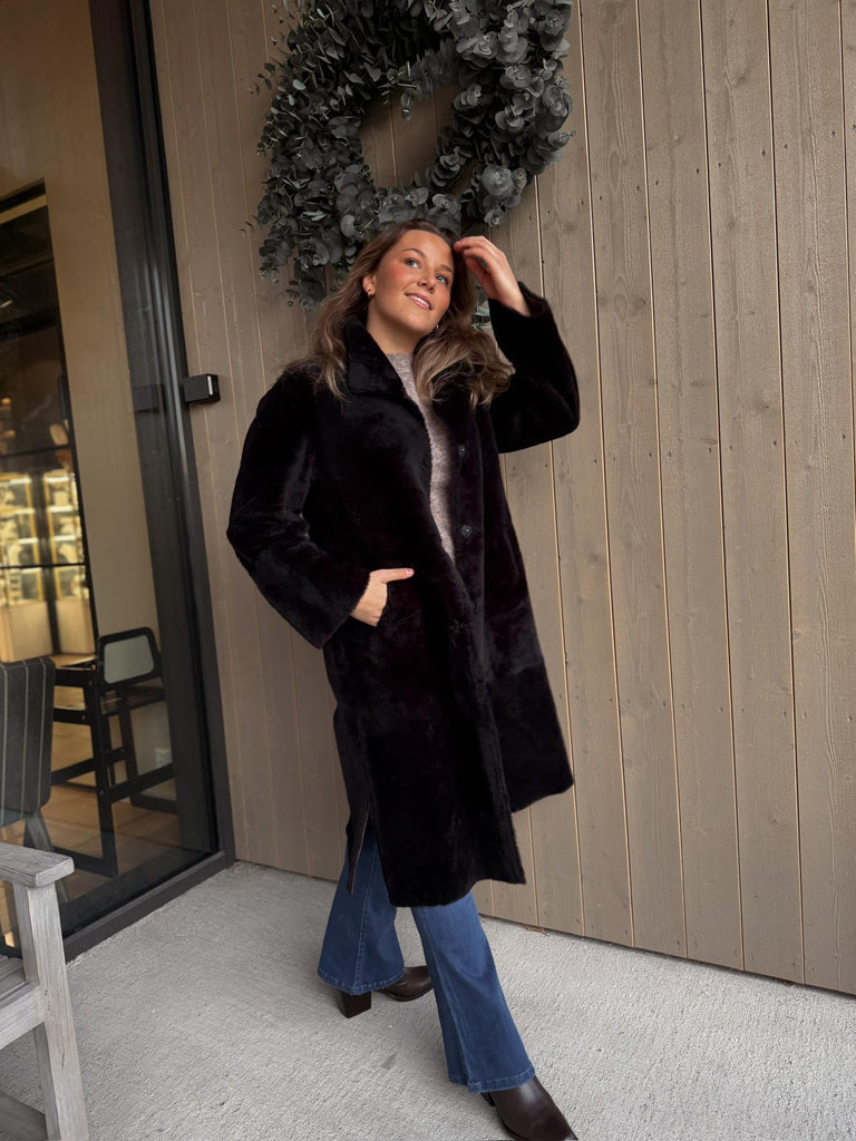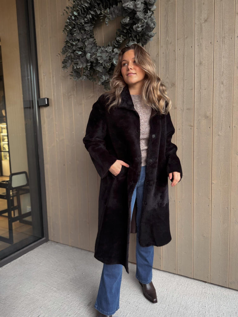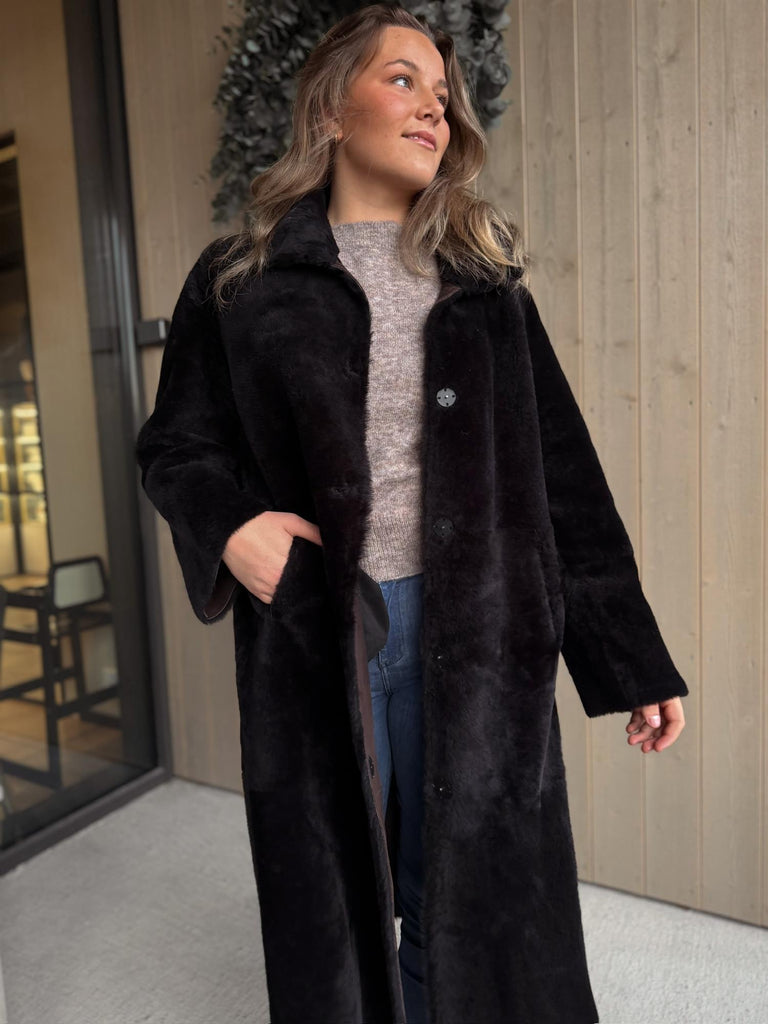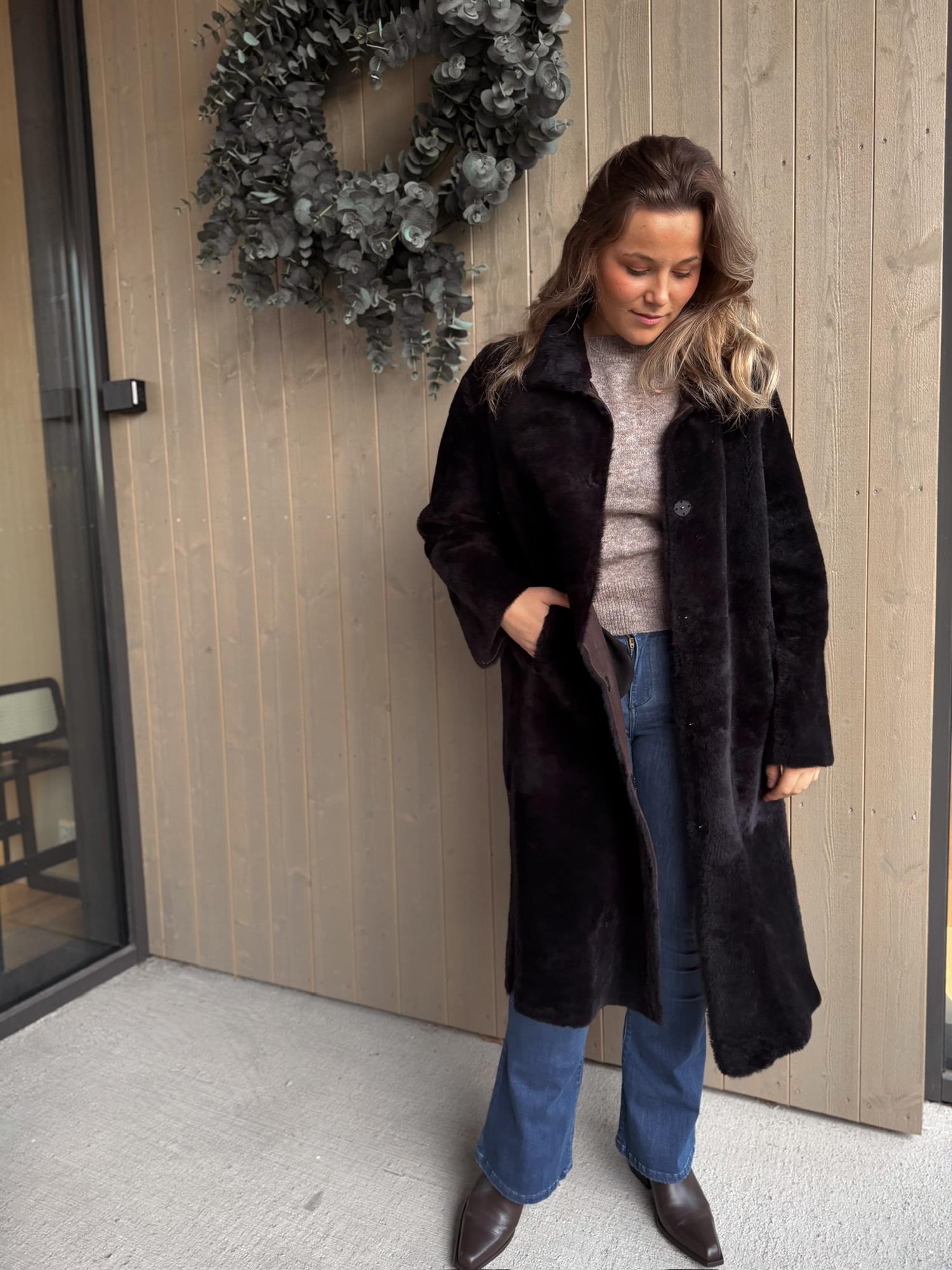 Klassisk og tidløs lang kåpe som kan brukes begge veier. Kåpen lukkes med knepping i front. Sidelommer i front og høy splitt i begge sider.
