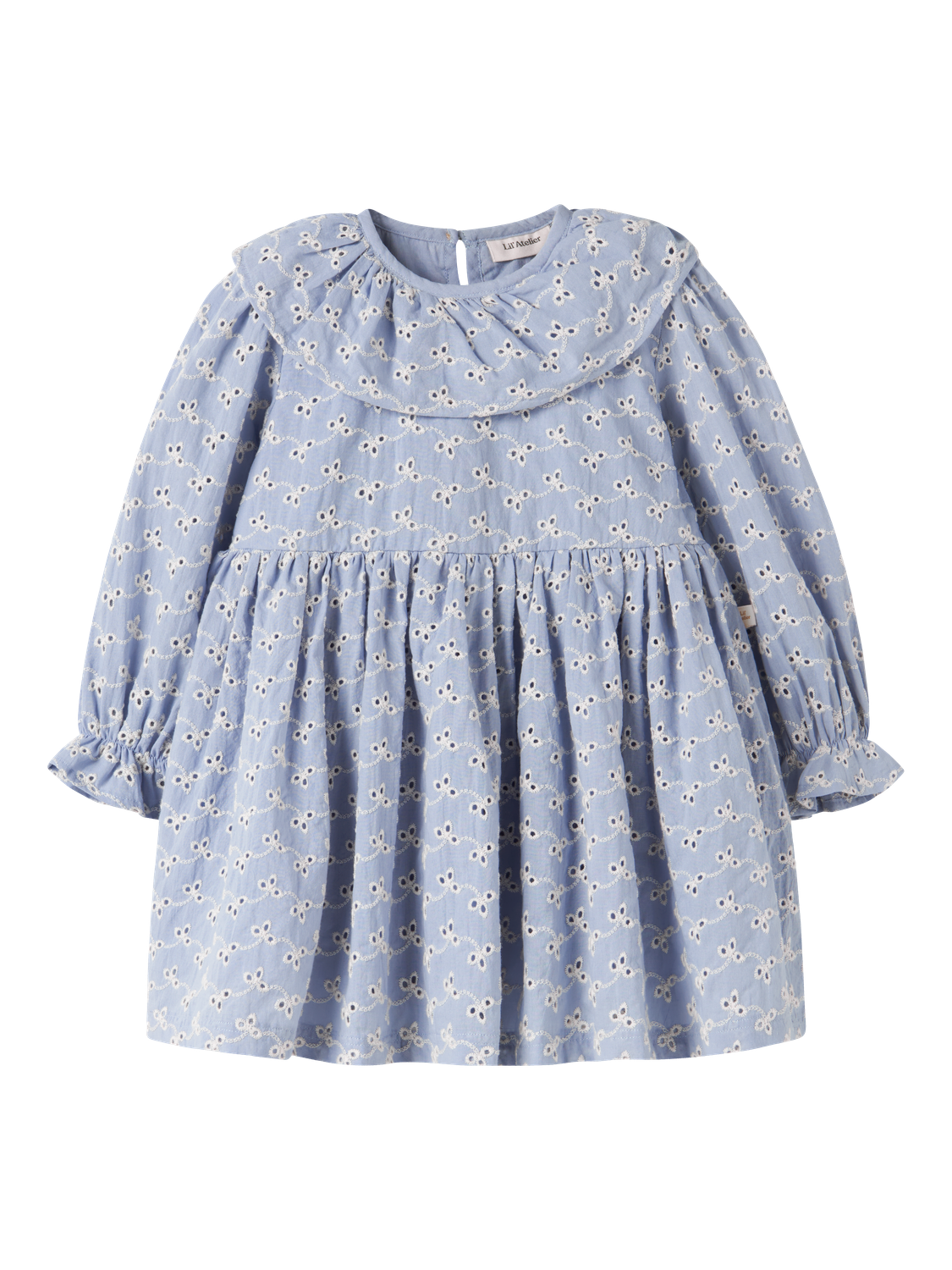 Oppdater barnets garderobe med NMFTESSIE LS LOOSE DRESS i en vakker lyseblå farge. Denne kjolen er laget av 100% økologisk bomull og har et elegant design med broderie anglaise detaljer, perfekte for spesielle anledninger.