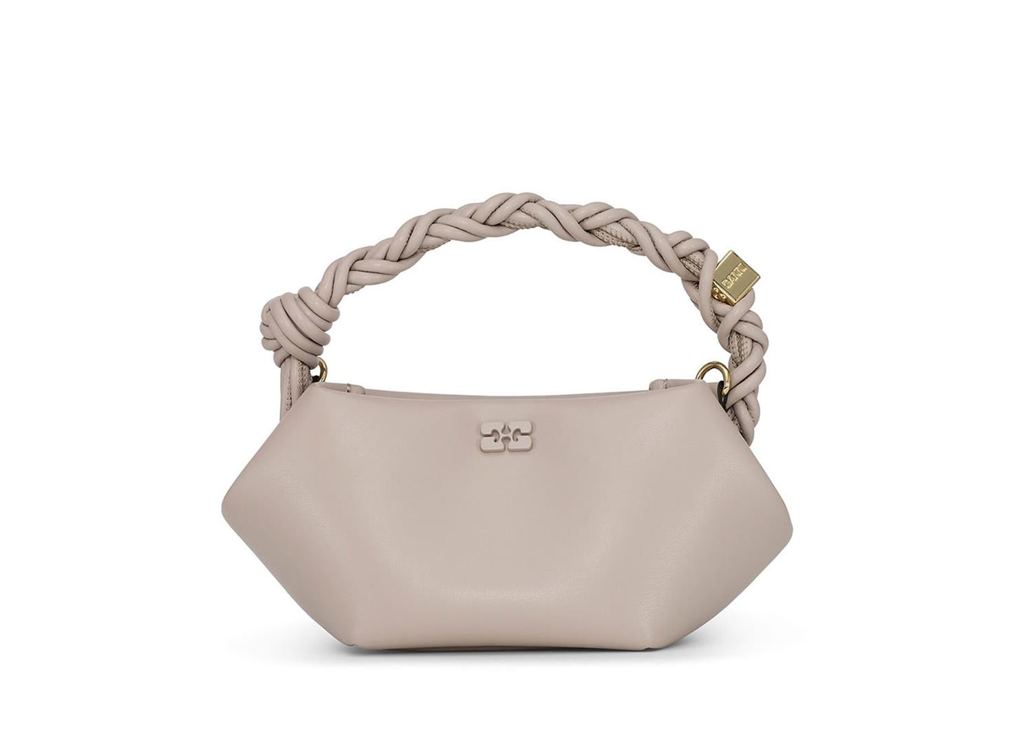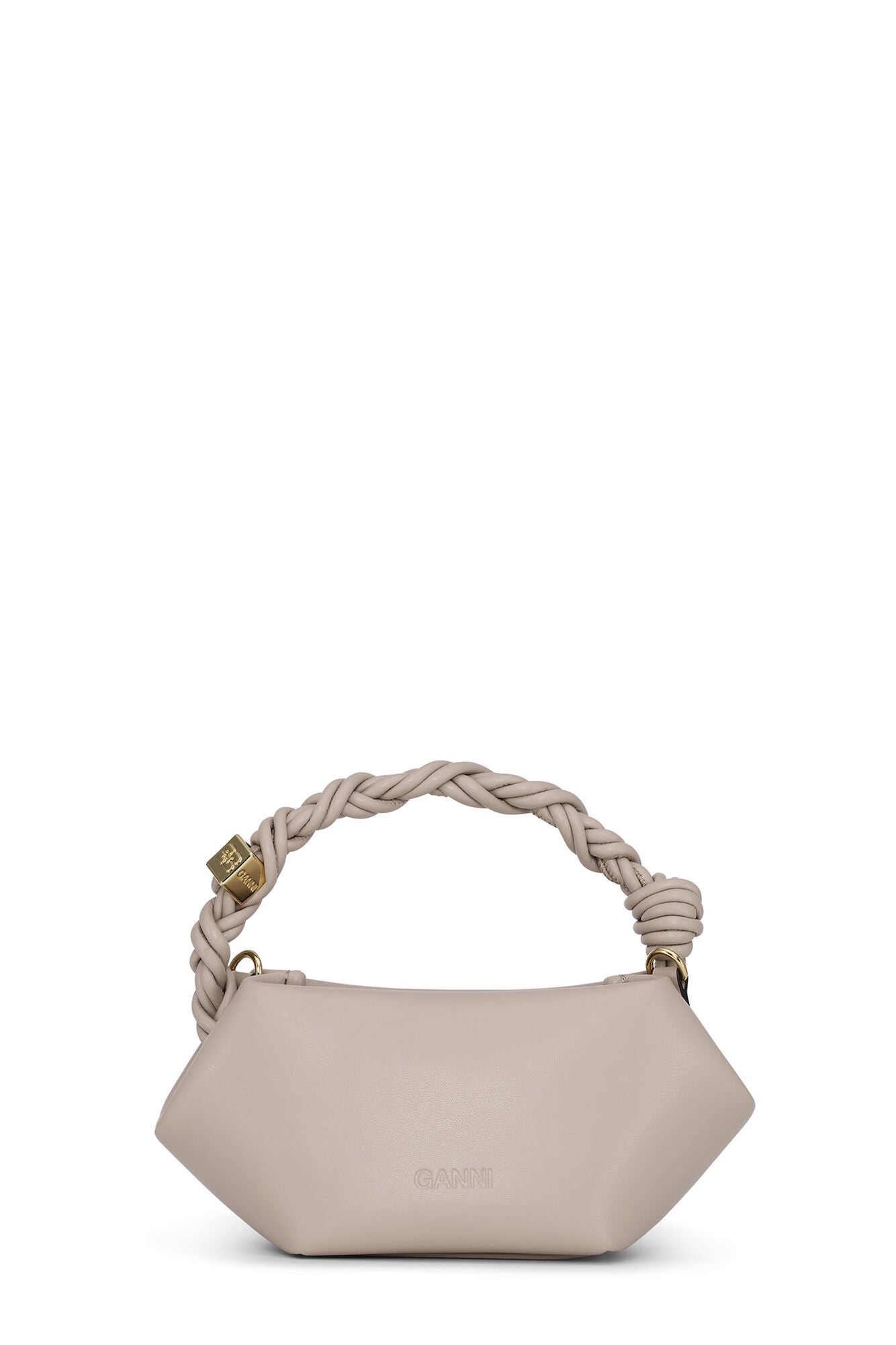 Light Grey Mini GANNI Bou Bag er laget av en blanding av recycled leather og er designet i en sekskantet form. Vesken har en metallisk, ton-i-ton GANNI «butterfly»-logo.