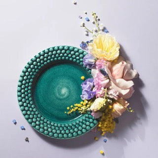 Bubbles stor Tallerken fra Mateus er den perfekte tallerken for hverdag eller selskap. Bubbles kolleksjonen er moderne og leken og har hentet inspirasjon av motens tradisjonelle prikkete mønster. Tallerkenen er preget av den glaserte overflaten og et bånd av det ikoniske prikkemønstert.