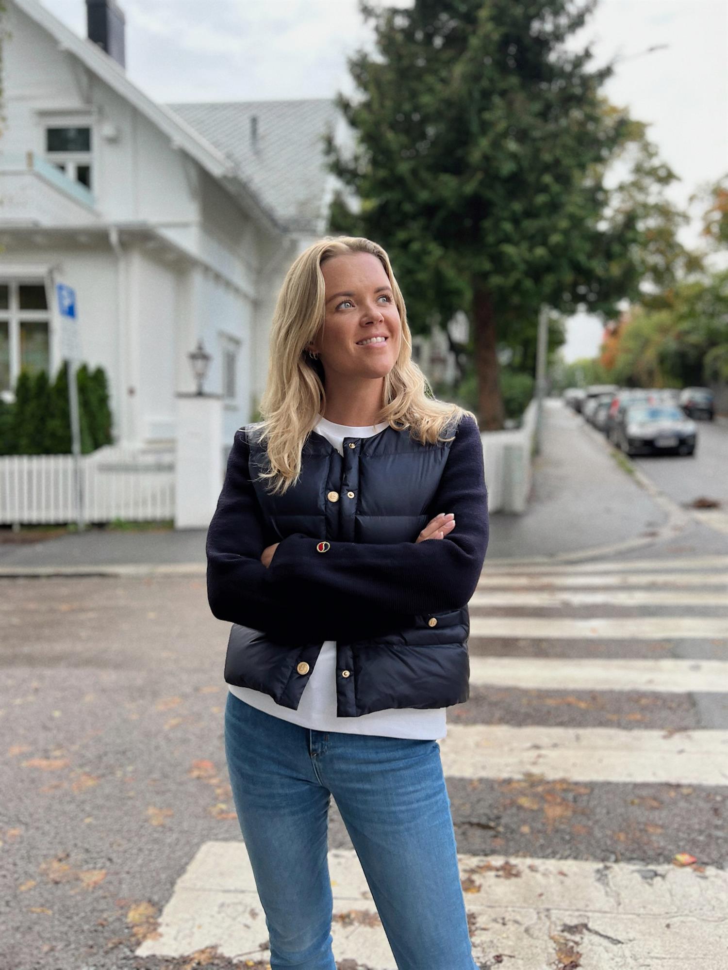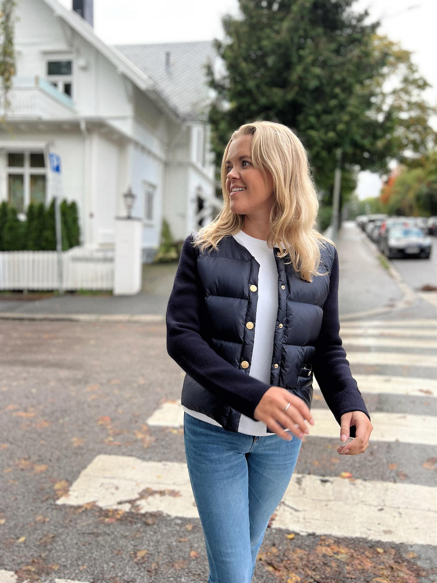 Iva Down Jacket fra Busnel kombinerer stilig design med varme og komfort, perfekt for kaldere dager og kvelder. Jakken har en kontrasterende front fylt med dun, mens ermene er strikket i ekstra fin merinoull. De åtte gyldne B-knappene og de to lommene foran gir jakken et luksuriøst uttrykk som er typisk for Busnel.