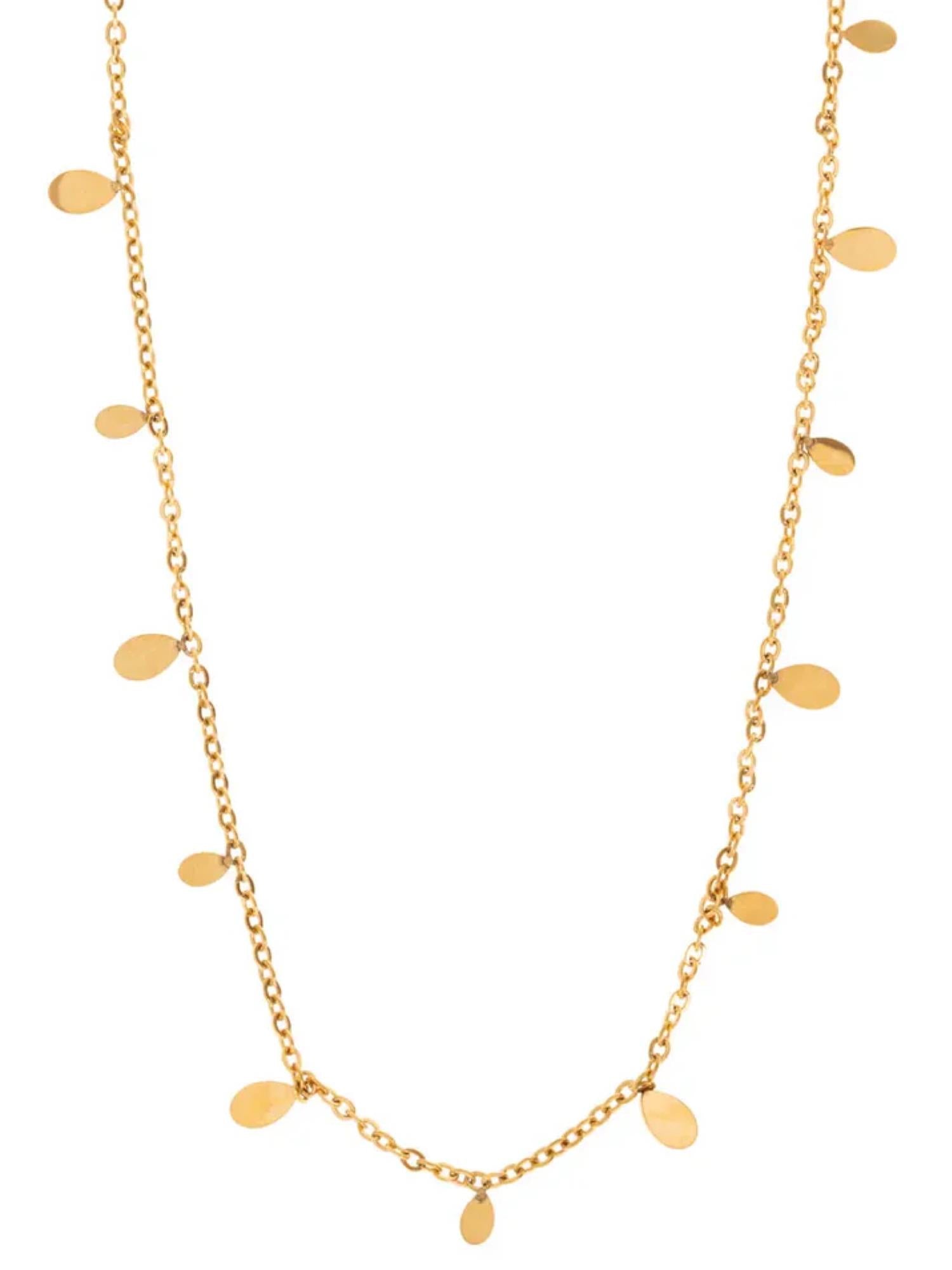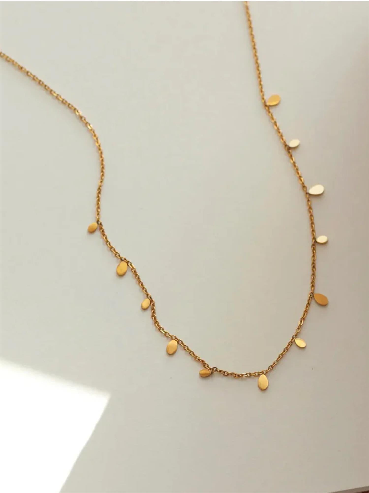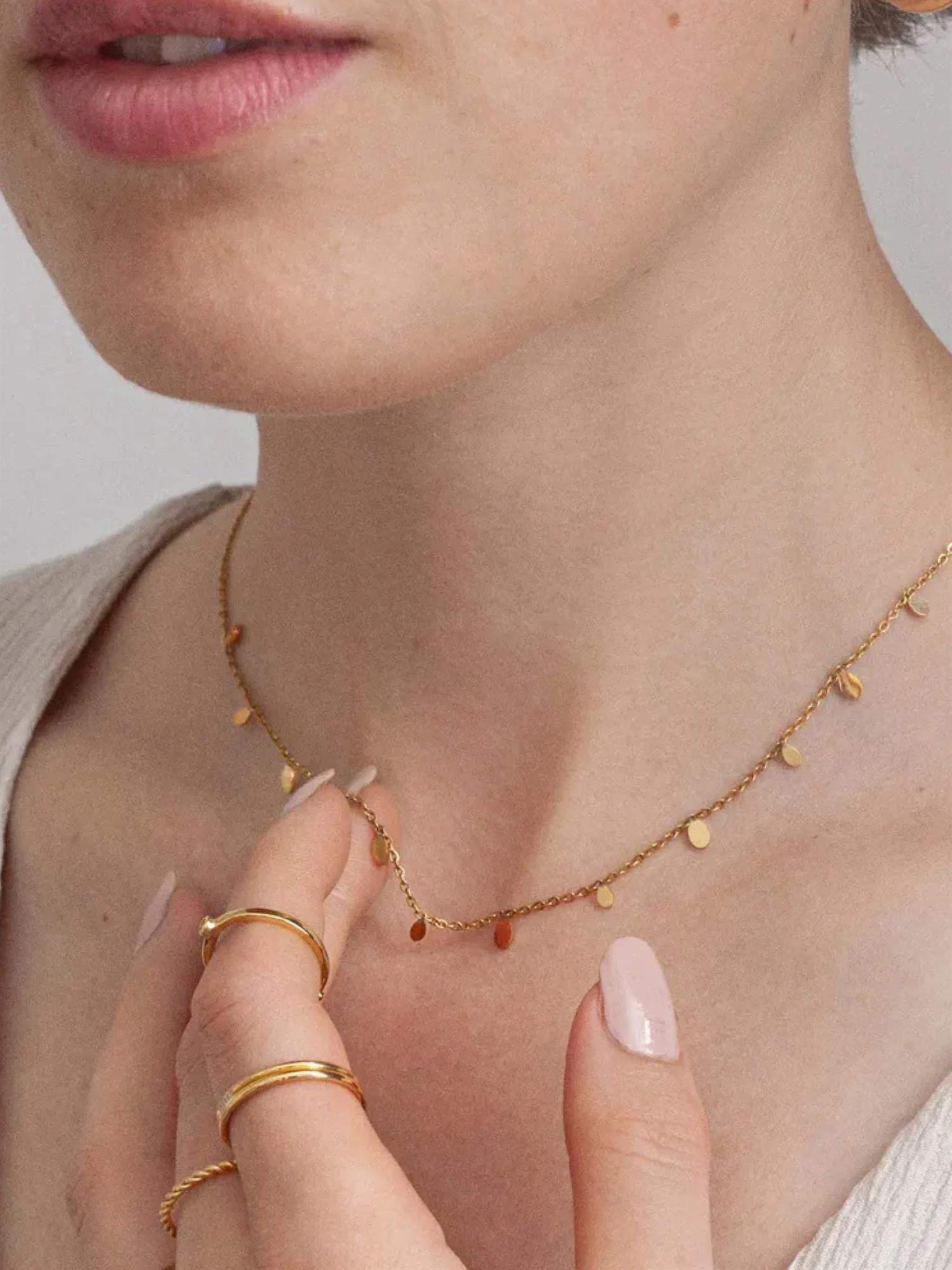 Vår rustfrie kolleksjon er laget for å tåle livet – dusj, svøm og tren uten å bekymre deg for misfarging. Dette delikate halskjedet har en tynn kjede pyntet med små ovale skiver som gir et elegant og fyldigere uttrykk. Perfekt alene, eller som base i et lag-på-lag-look.