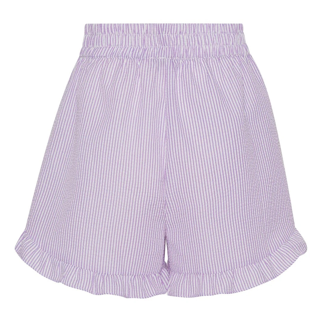 Sonja-shorts er laget av et stripet crepemateriale og er et par korte, løstsittende shorts. De er elastikk i livet og har en subtil flæsedetalje nederst. Shortsen er normal i størrelsen.