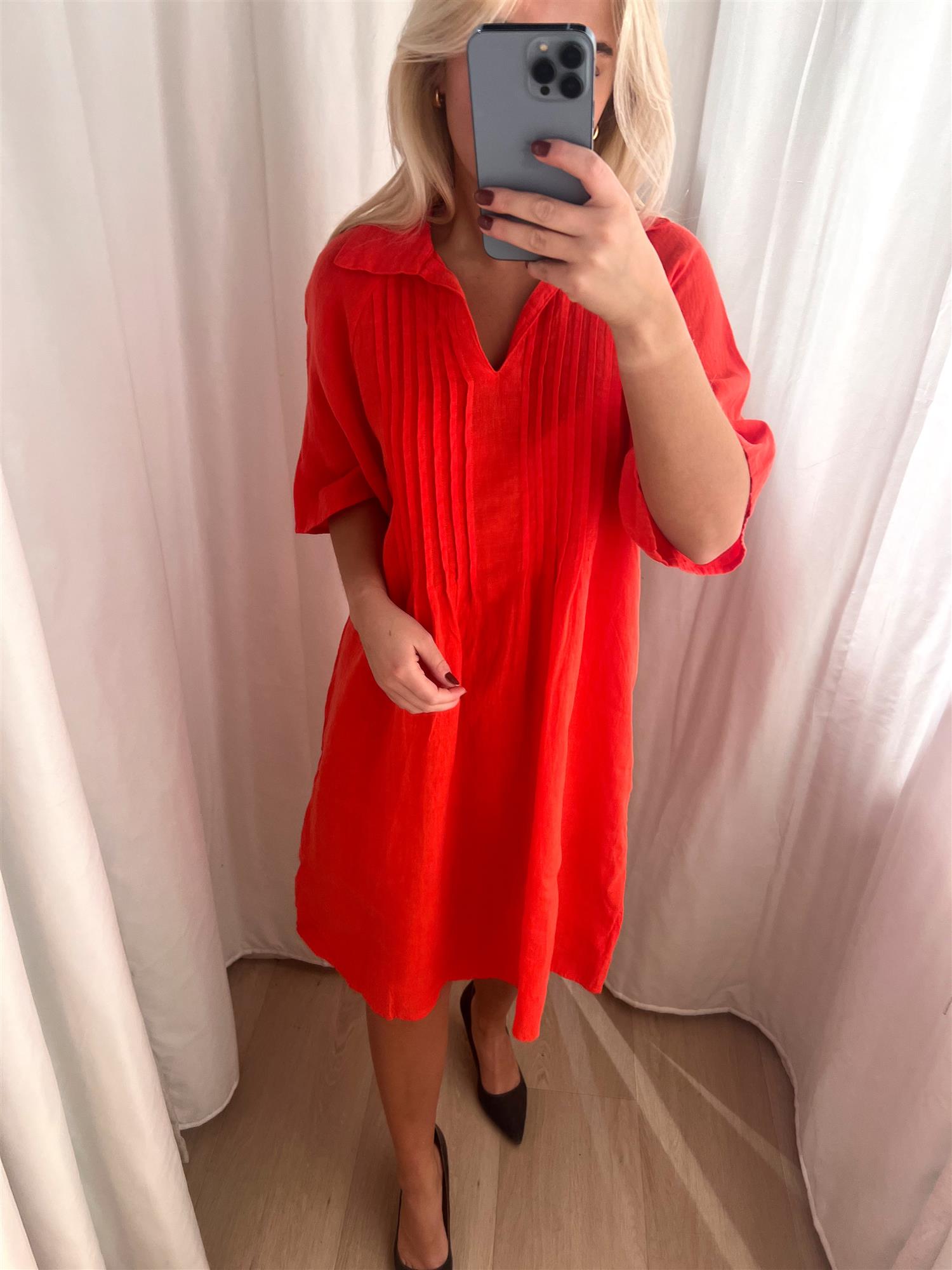 Den perfekte kjolen for en stilfull og komfortabel look. Laget av 100% lin, gir denne kjolen både pusteevne og en lett følelse, ideell for varme dager. Med sin A-formede passform og knelengde, er denne kjolen et flott valg for enhver anledning.
