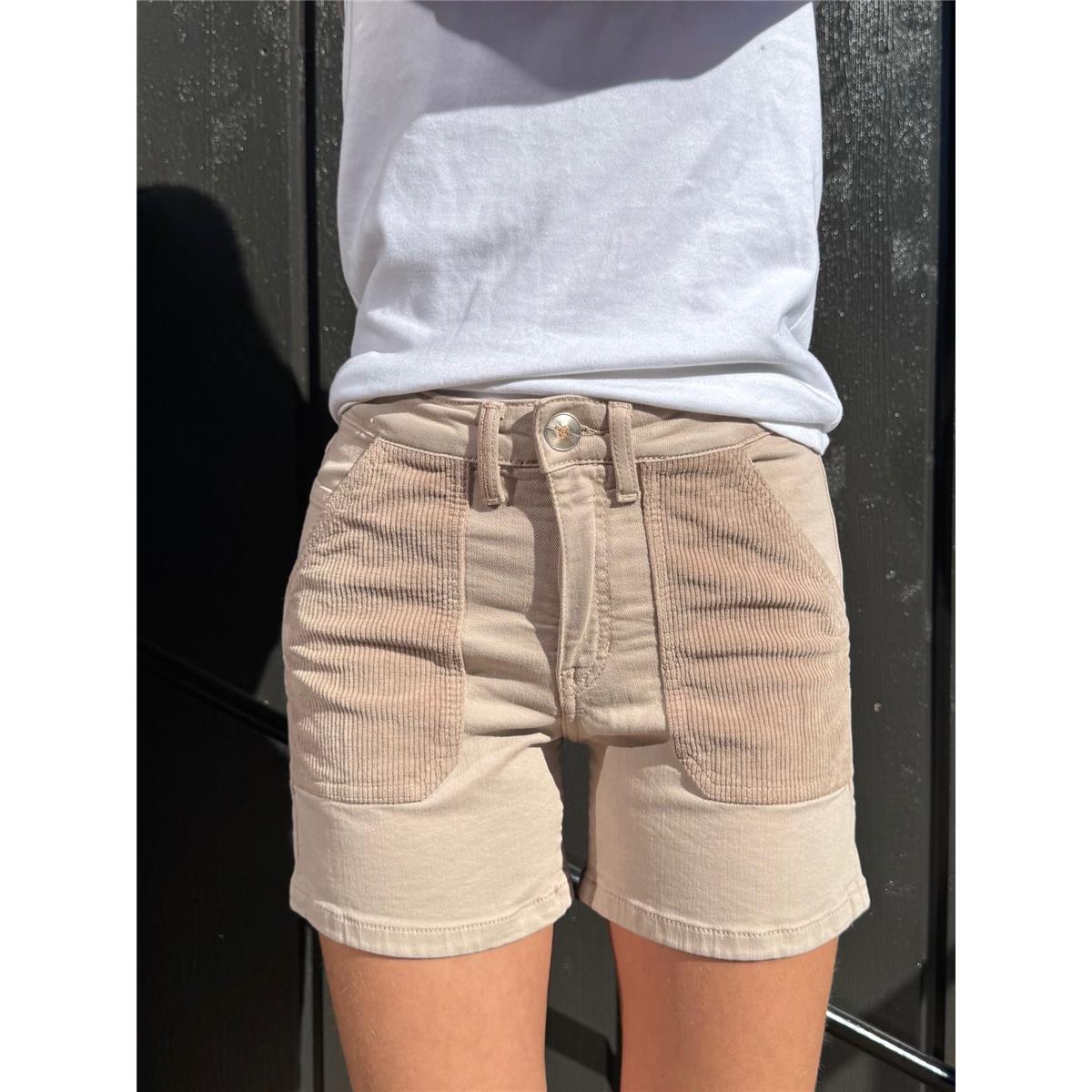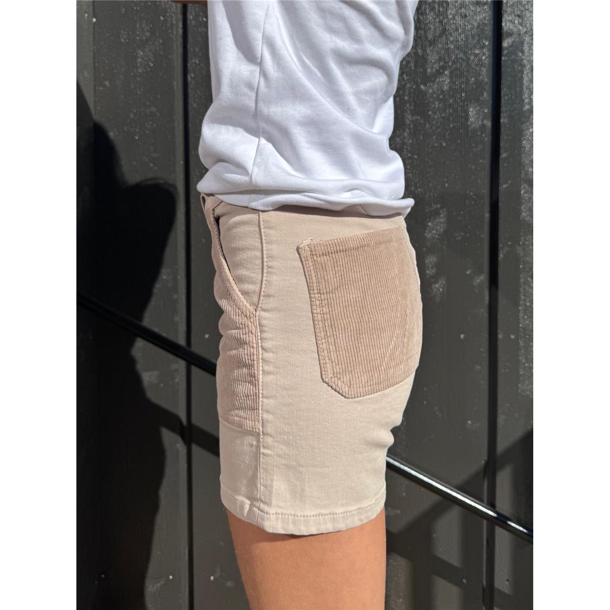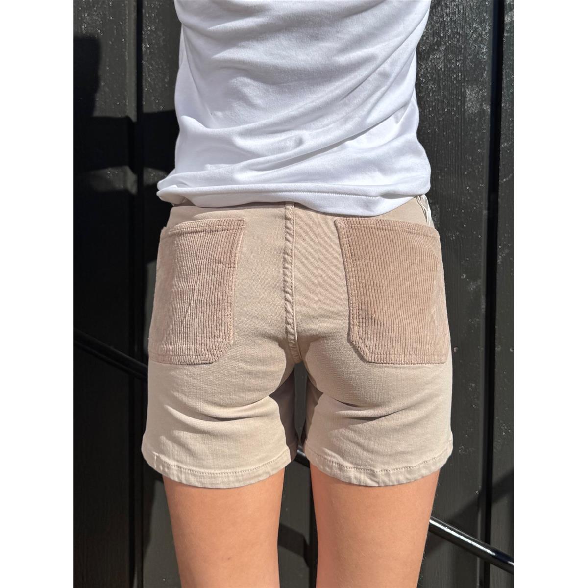 Fronten er preget av dekorative paneler i kordfløyel som skaper en interessant teksturkontrast mot den glatte bomullskvaliteten. Store, påsydde frontlommer gir shortsen et praktisk og arbeidstøy-inspirert preg, samtidig som de bidrar til et stilrent og gjennomført design.