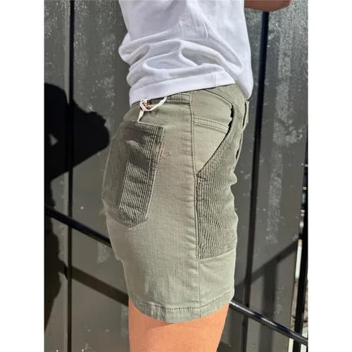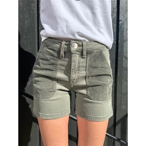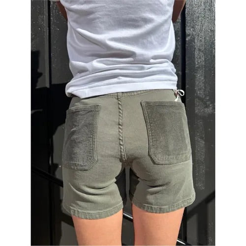 Fronten er preget av dekorative paneler i kordfløyel som skaper en interessant teksturkontrast mot den glatte bomullskvaliteten. Store, påsydde frontlommer gir shortsen et praktisk og arbeidstøy-inspirert preg, samtidig som de bidrar til et stilrent og gjennomført design.