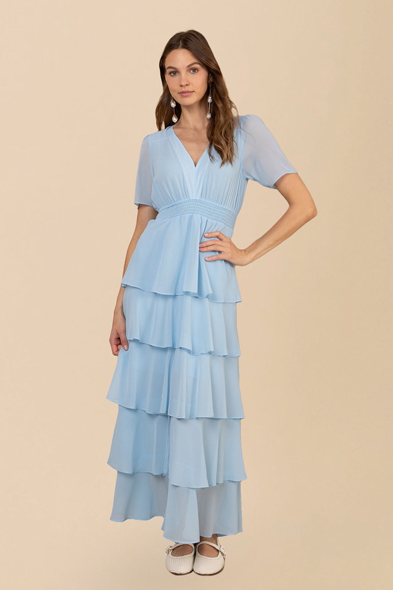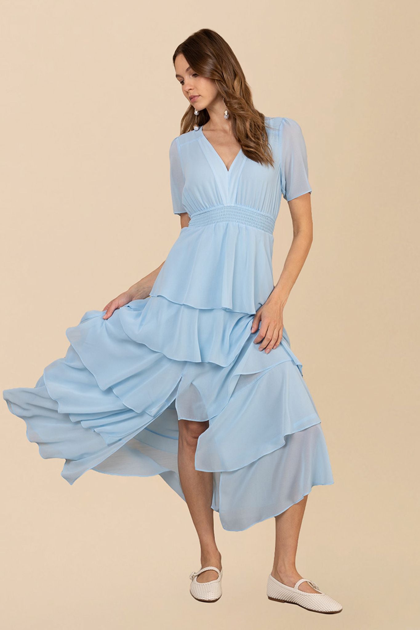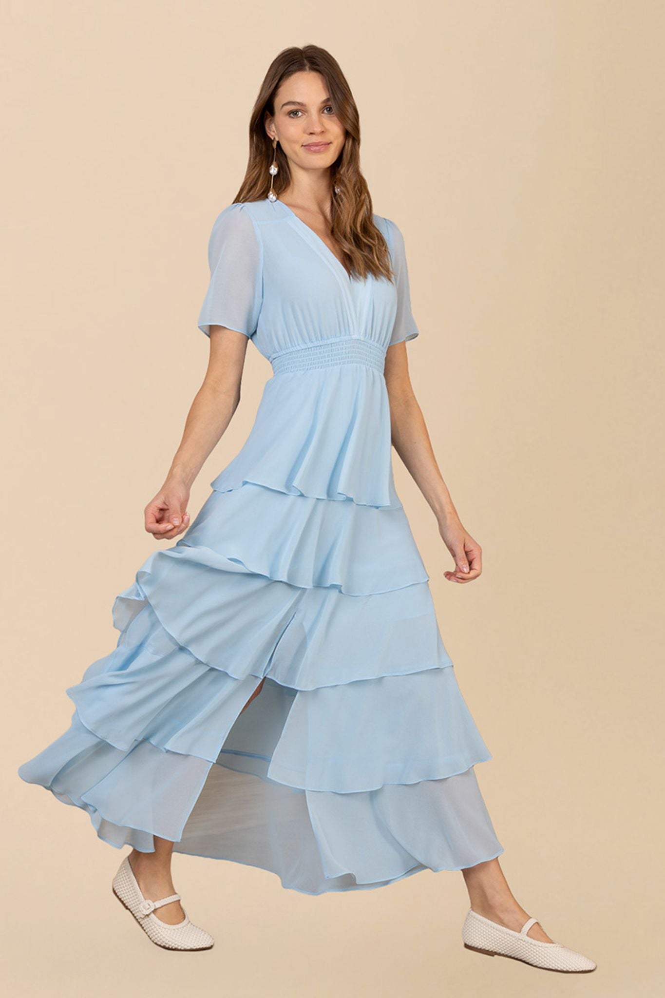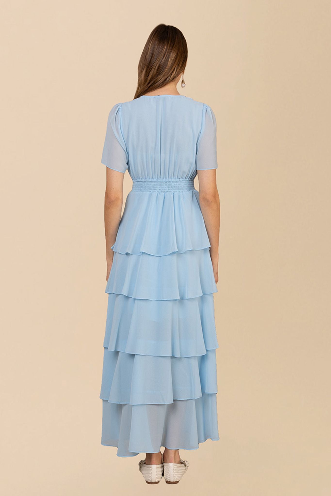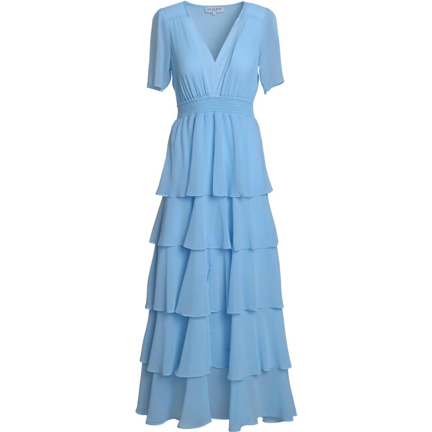 Imogene kjolen i blått er en elegant og stilfull kjole laget av myk, vasket chiffon. Den har en flatterende, lagdelt design med korte ermer og en maxi lengde som gir et sofistikert preg. Perfekt for spesielle anledninger.