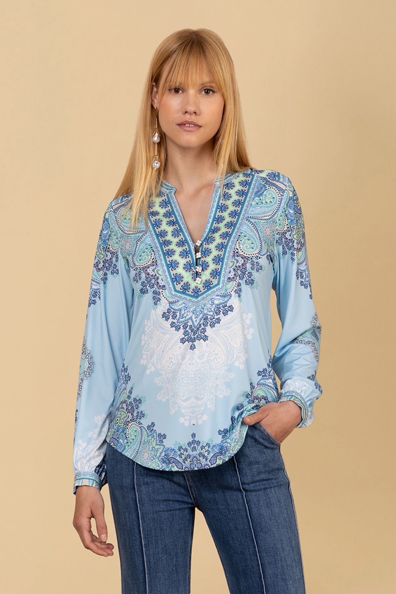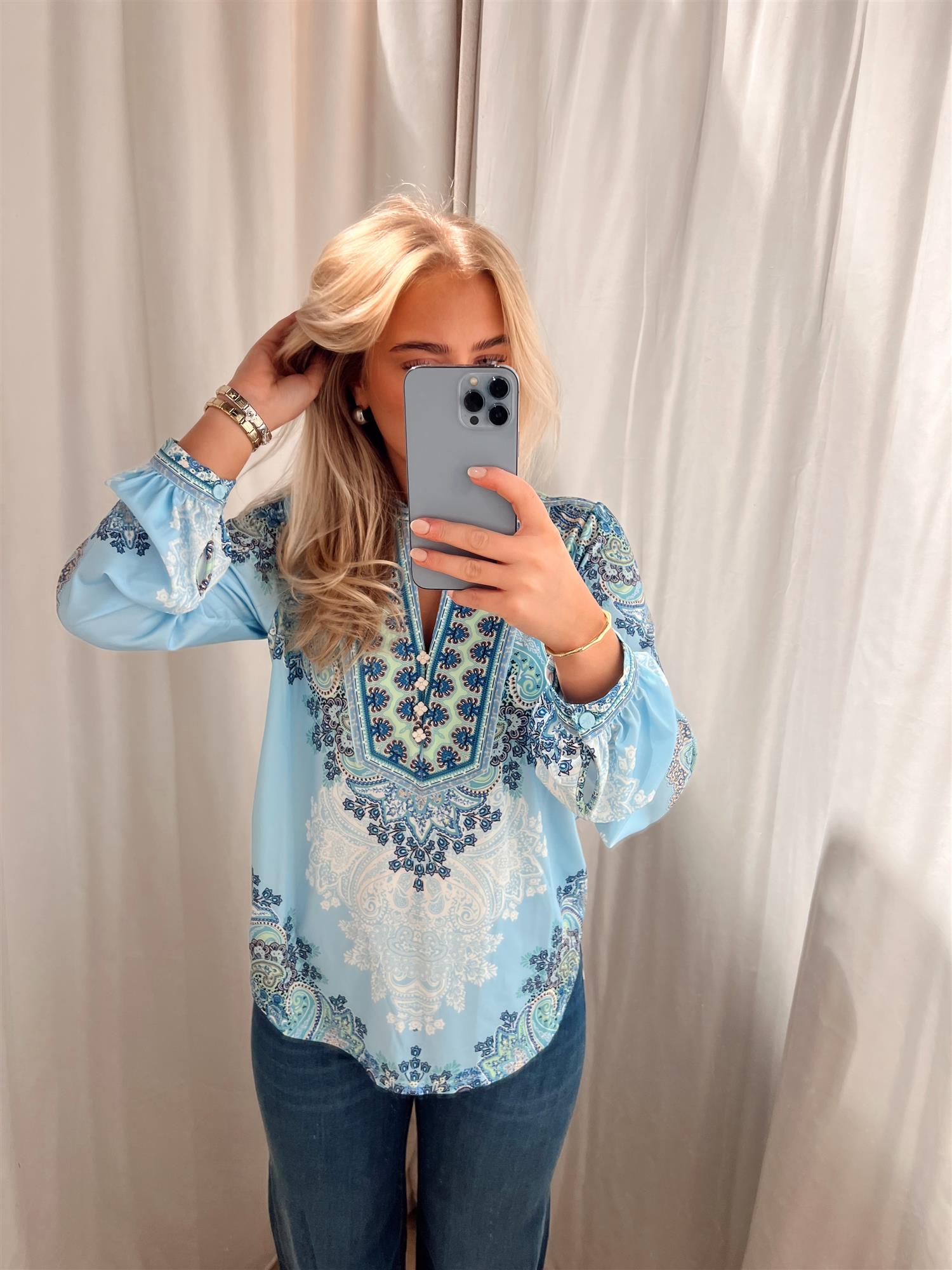 Azaria-toppen i en vakker blåfarge er et stilrent valg for enhver anledning. Den kombinerer komfort og stil, og er perfekt for de som ønsker å se bra ut uten å gå på kompromiss med komforten.