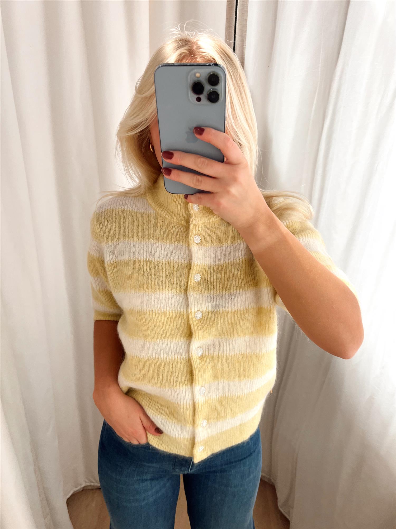 En feminin og elegant kortermet cardigan i RAH OSLOs populære kidmohair-kvalitet. Cardiganen har et delikat stripet uttrykk, perleknapper i front og en lett avrundet hals som gir et sofistikert preg. Den myke og luftige kvaliteten gjør den perfekt til både hverdag og mer pyntede anledninger.