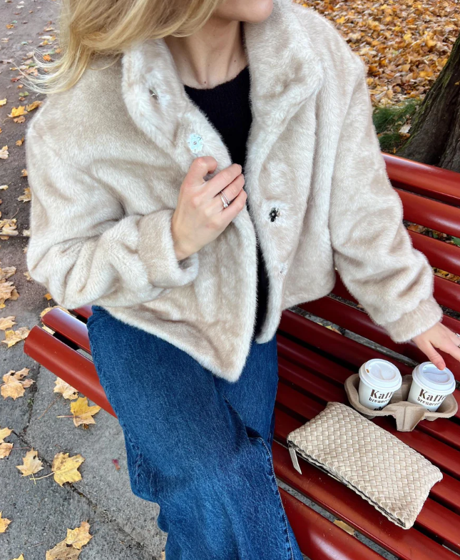 Den myke fuskepelsen føles eksklusiv mot huden og gir et varmt og chic uttrykk – perfekt til både hverdags og fest. Passformen er normal til noe romslig, slik at du enkelt kan style den over både gensere og kjoler.