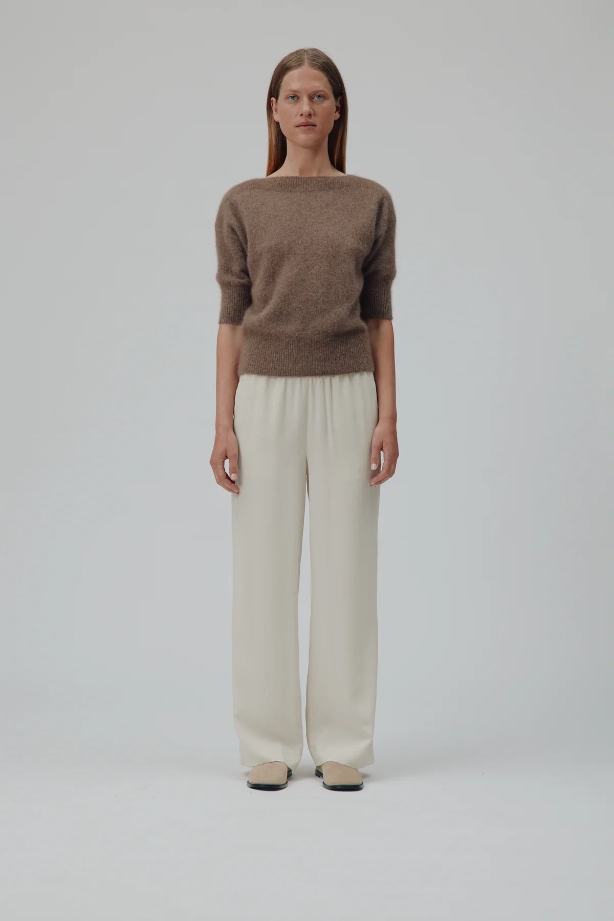- Hals: Elegant båthals som fremhever skuldrene og gir et sofistikert uttrykk.