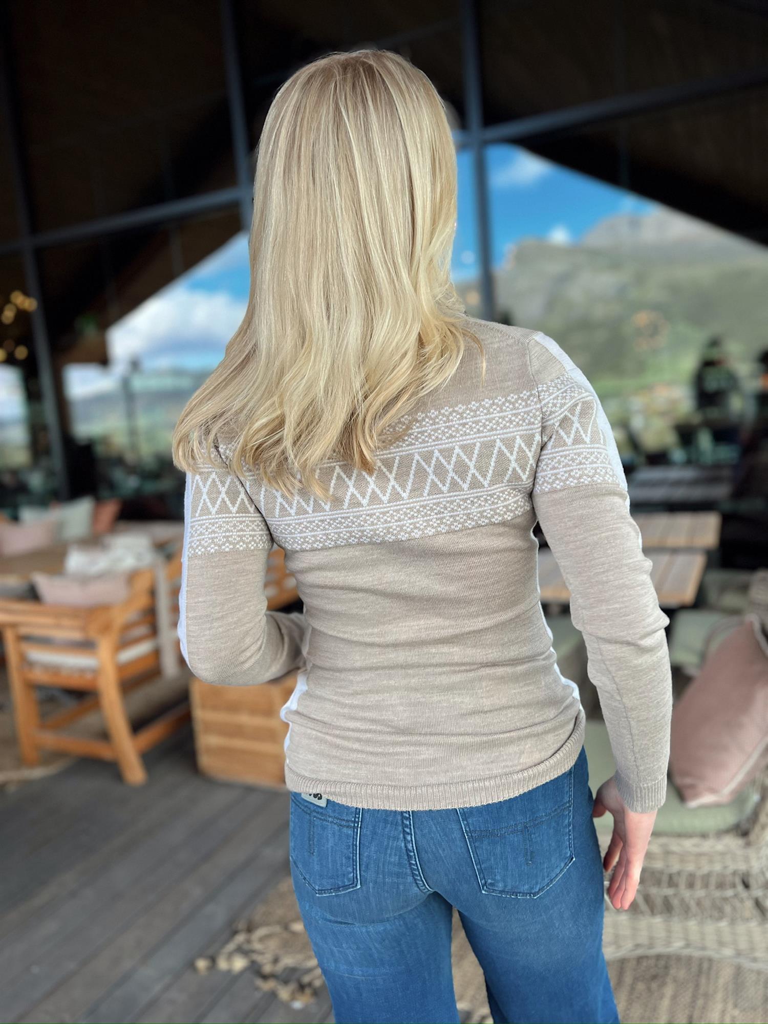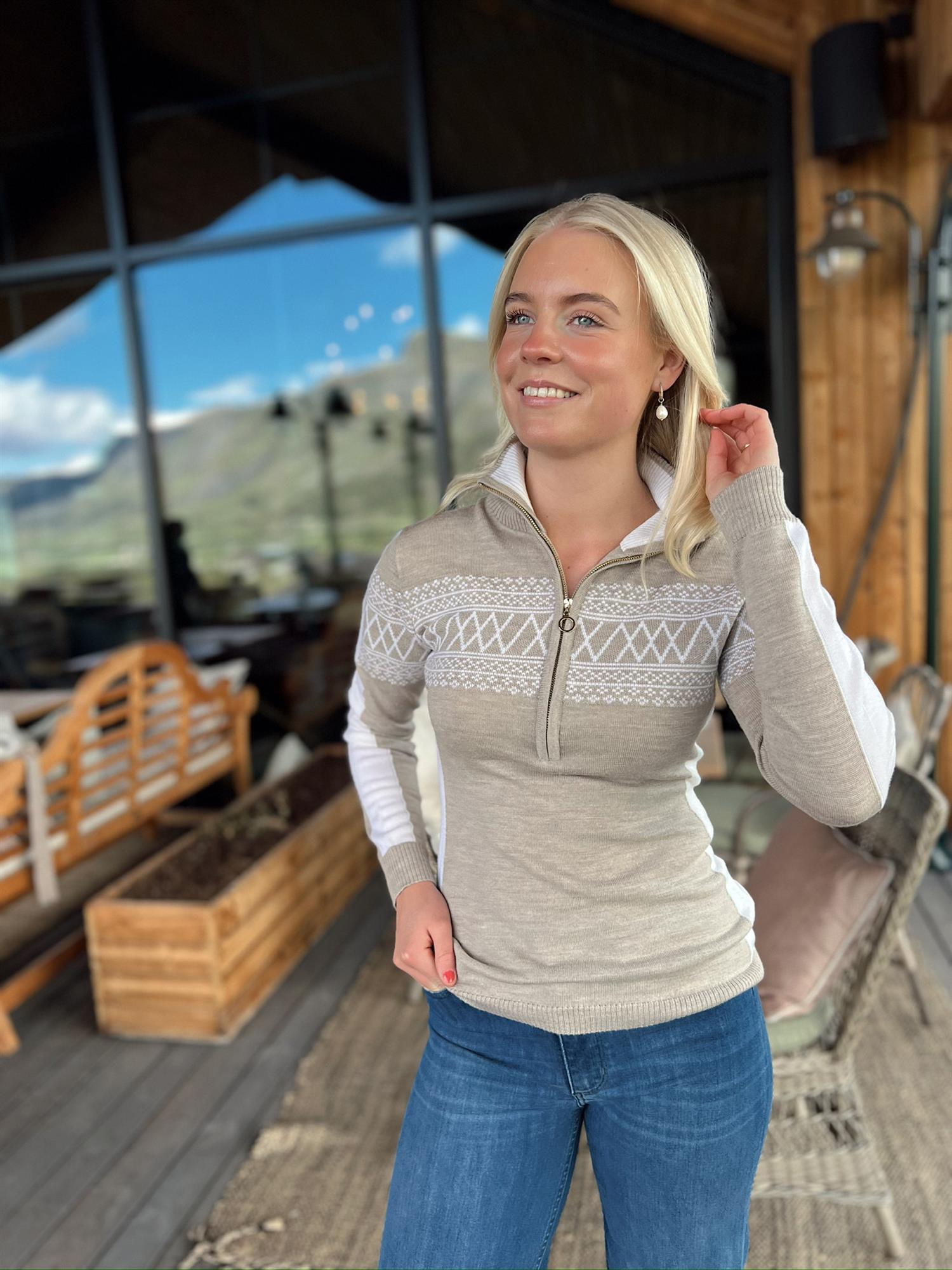 Signature 1/4-Zip fra We Norwegians er en oppdatert versjon av sesongens klassiker. Designet henter inspirasjon fra det tradisjonelle Setesdalsmønsteret, kombinert med sporty detaljer som kontrastfarget intarsia på ermer og sidepaneler. Den figurnære fasongen gir et moderne og flatterende uttrykk, samtidig som den gjør genseren enkel å bruke både til aktivitet og fritid.
