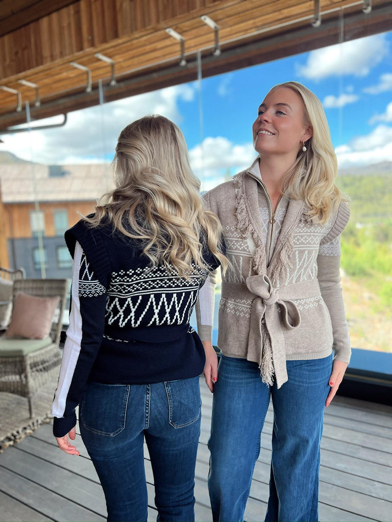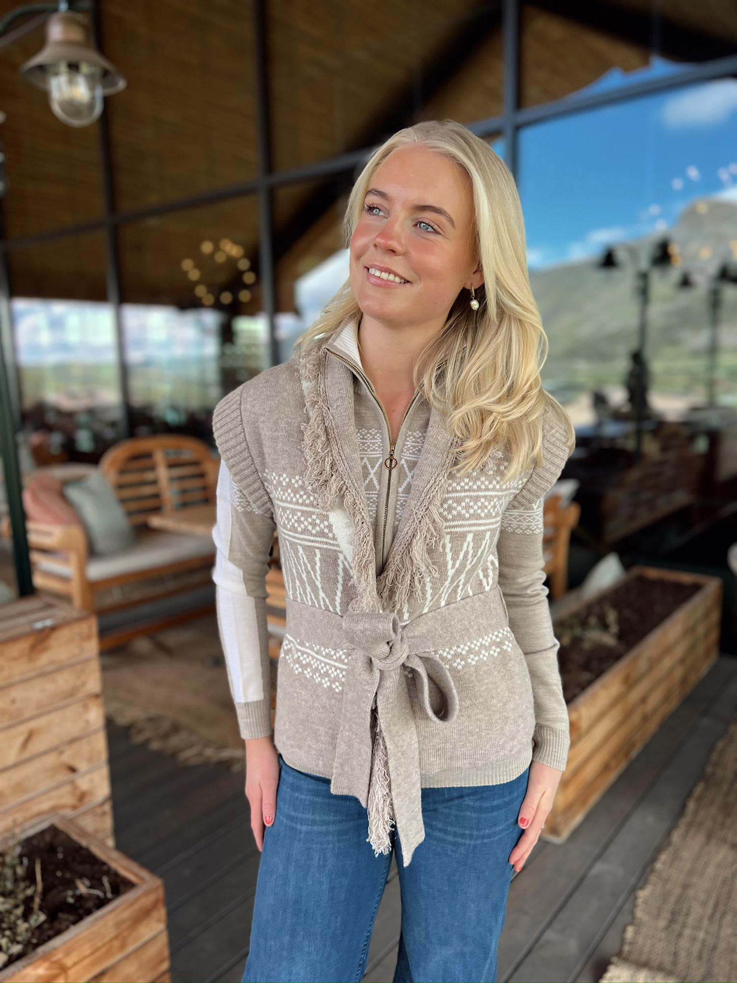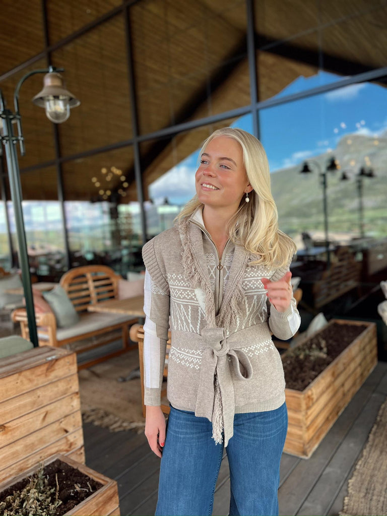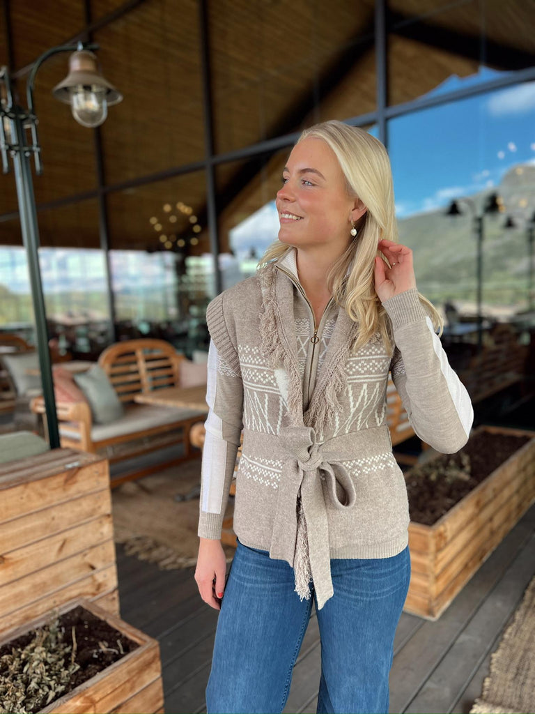 Setesdal Vest fra We Norwegians er en moderne tolkning av tradisjonelle norske strikkemønstre. Vesten er laget i en luksuriøs blanding av merinoull og kasjmir, som gir en myk og eksklusiv følelse. Designet har en omslagsfasong med sjalskrage kantet med frynser, og et matchende strikket belte som kan knytes for en flatterende passform.