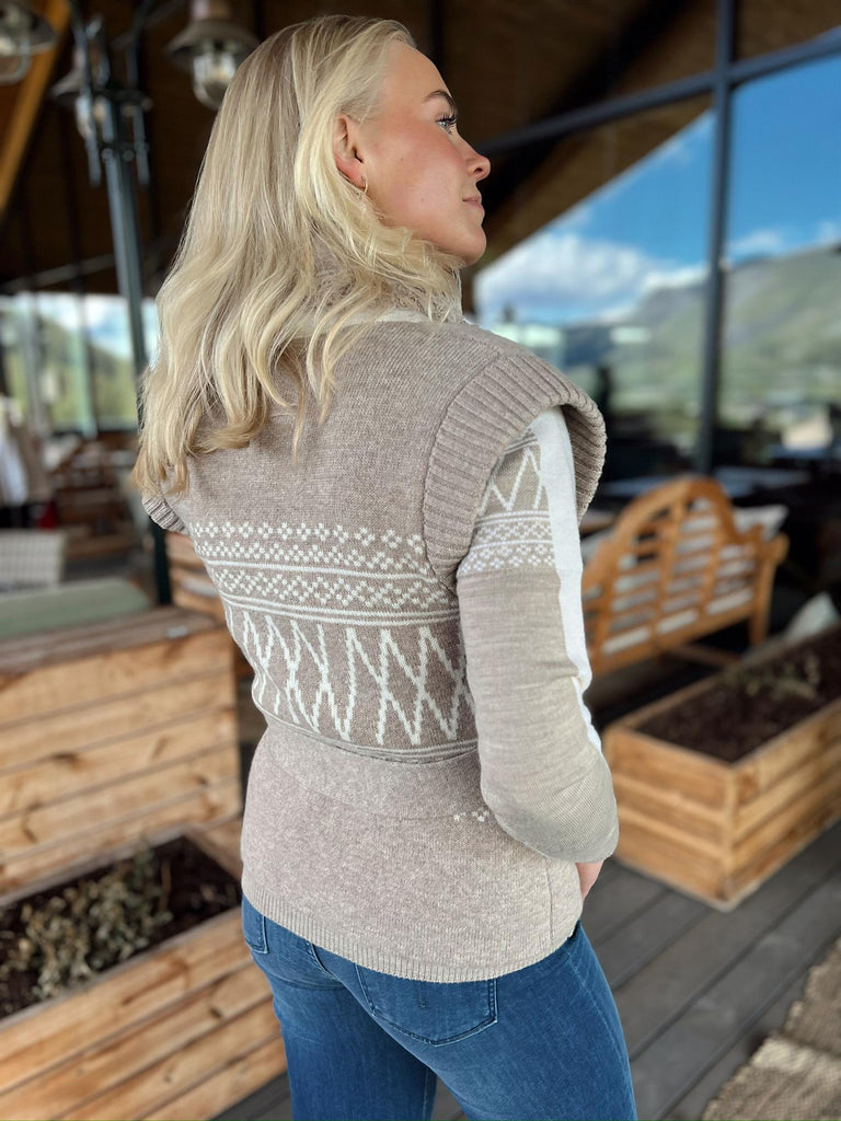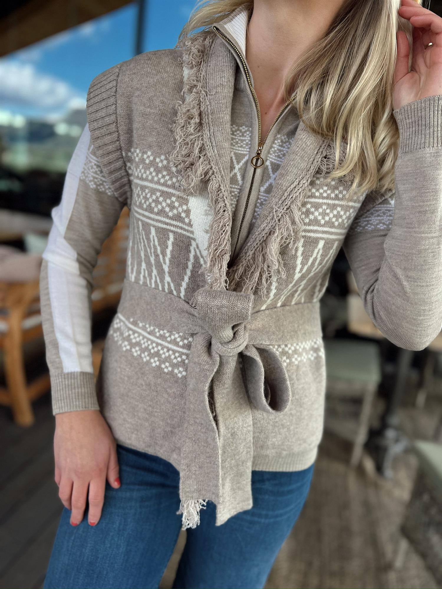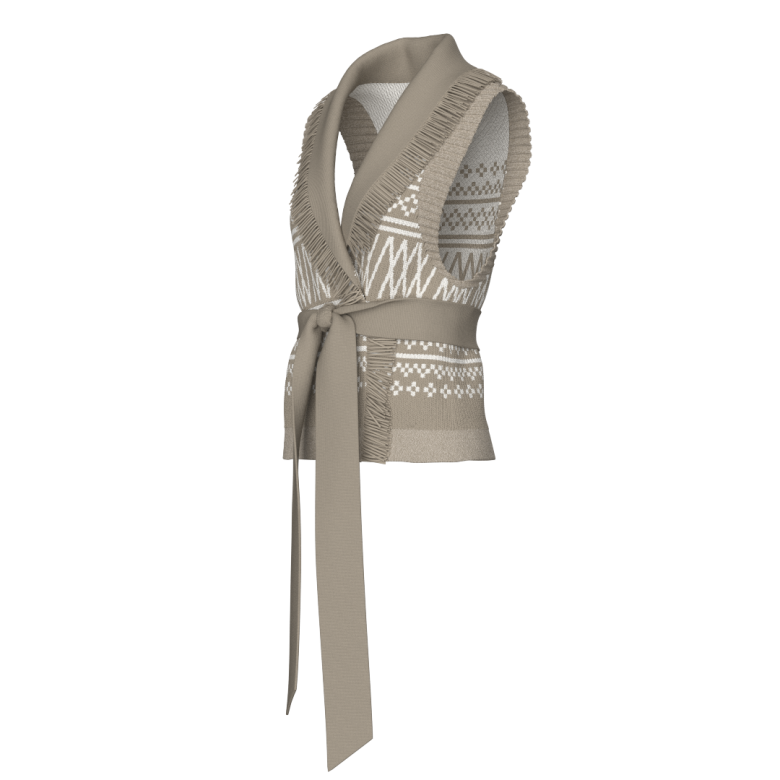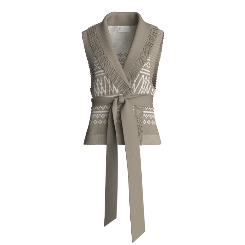 Setesdal Vest fra We Norwegians er en moderne tolkning av tradisjonelle norske strikkemønstre. Vesten er laget i en luksuriøs blanding av merinoull og kasjmir, som gir en myk og eksklusiv følelse. Designet har en omslagsfasong med sjalskrage kantet med frynser, og et matchende strikket belte som kan knytes for en flatterende passform.