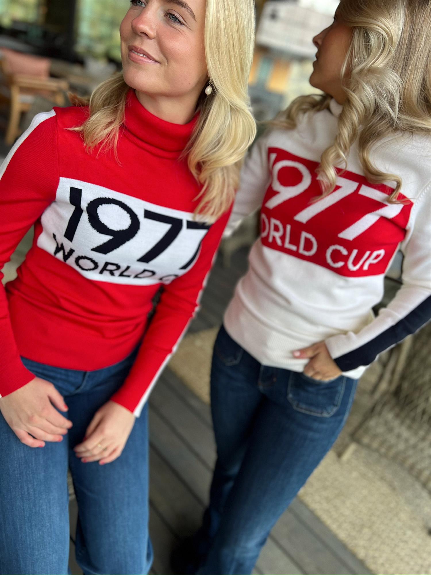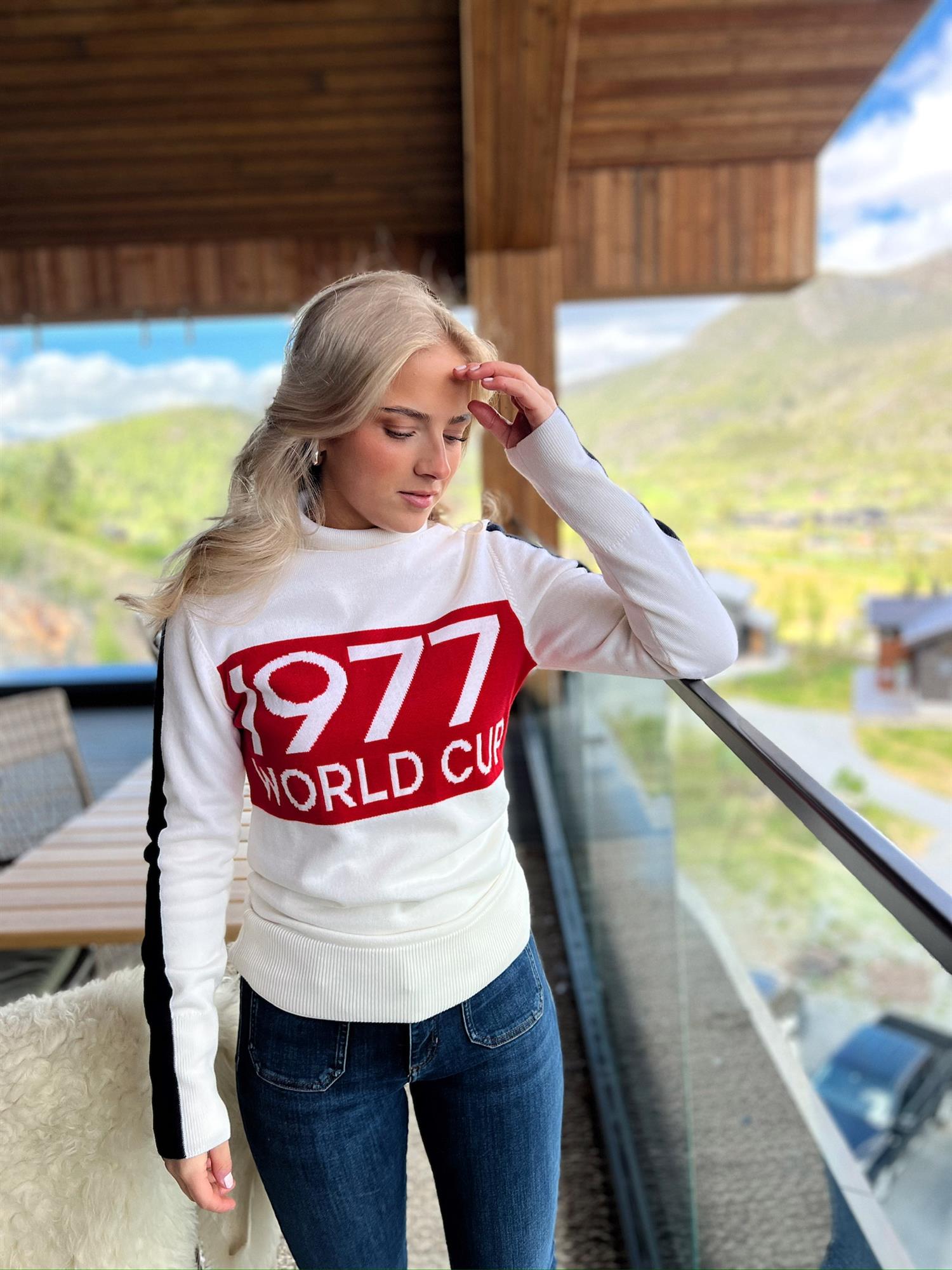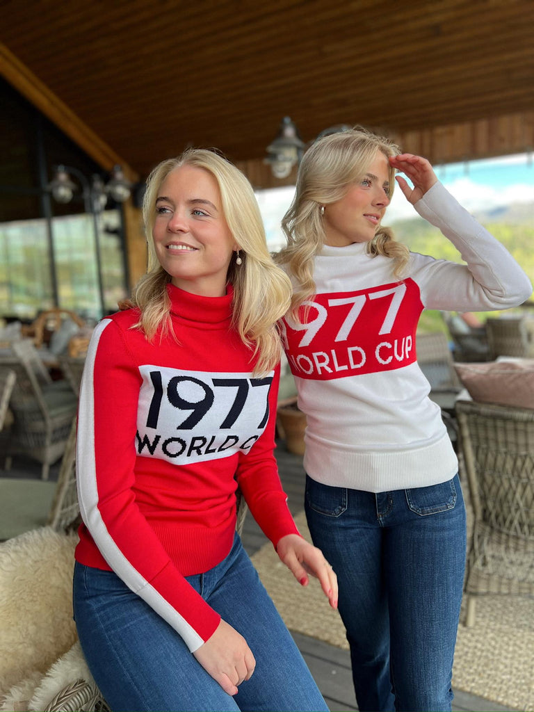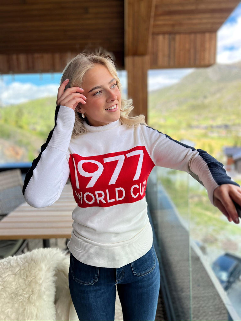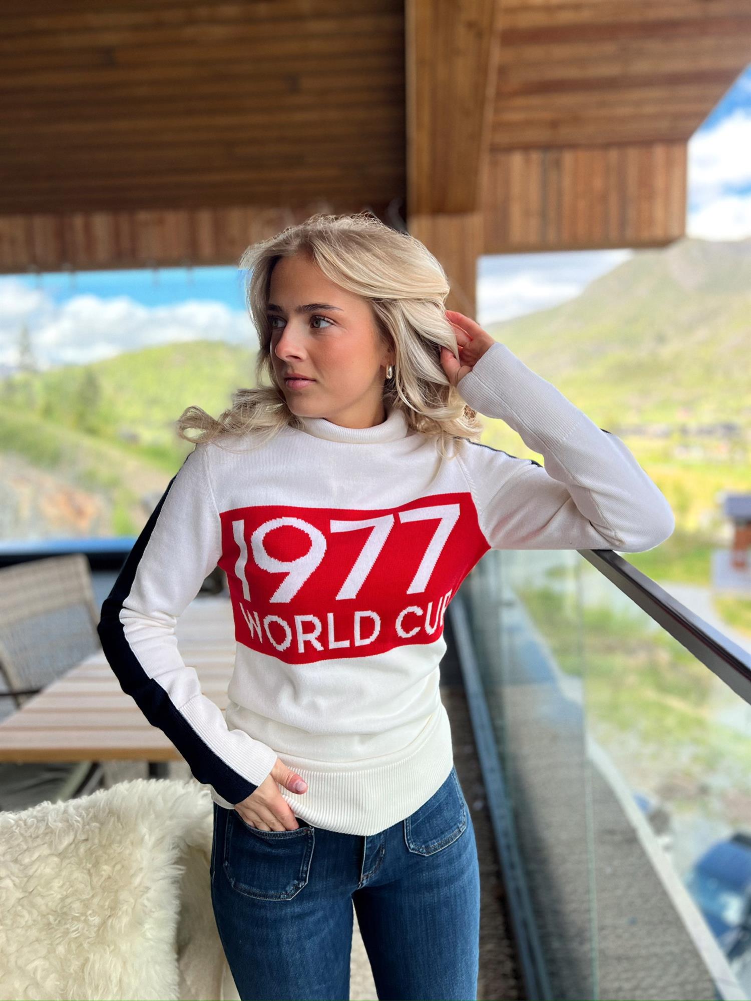 1977 Sweater fra We Norwegians hyller den legendariske verdenscupen i Voss, der den svenske skilegenden Ingemar Stenmark tok sitt første gull etter flere forsøk.
