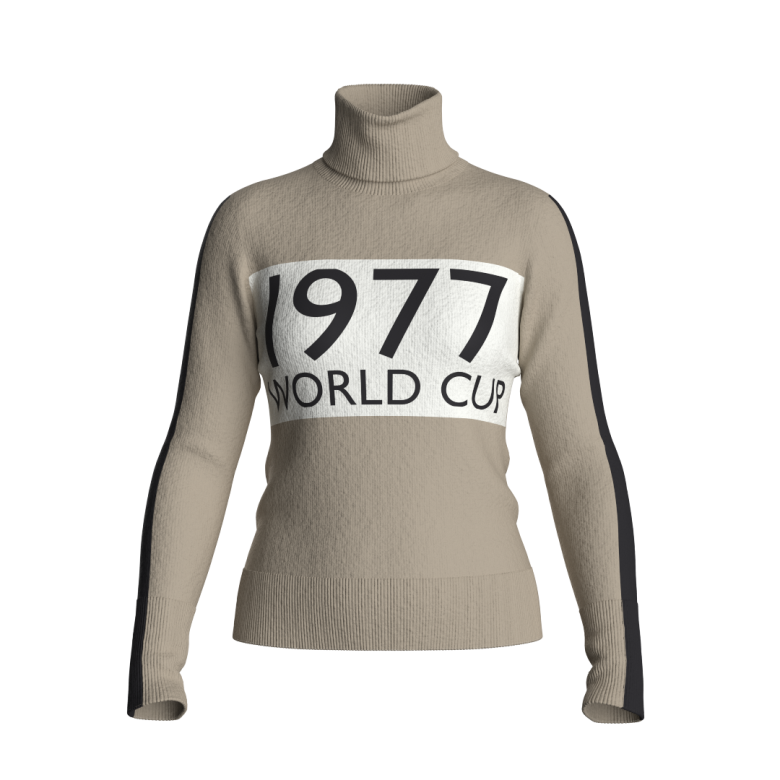 1977 Sweater fra We Norwegians hyller den legendariske verdenscupen i Voss, der den svenske skilegenden Ingemar Stenmark tok sitt første gull etter flere forsøk.